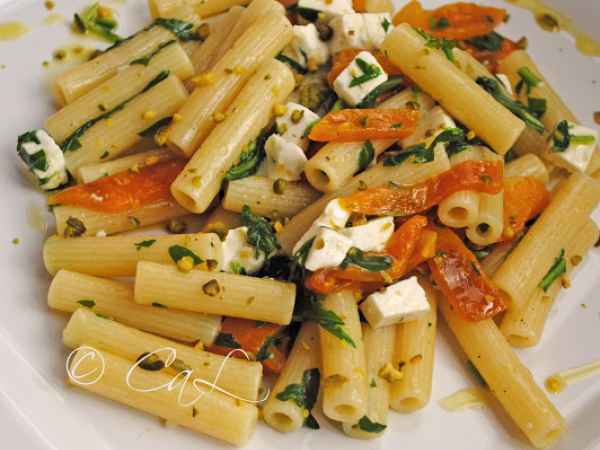 Pasta ai peperoni, rucola, primosale e trito di pistacchi