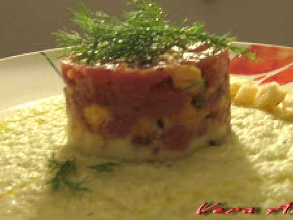 Tartare di salmone, avocado, fisalis e fragole con la granella di pistacchi