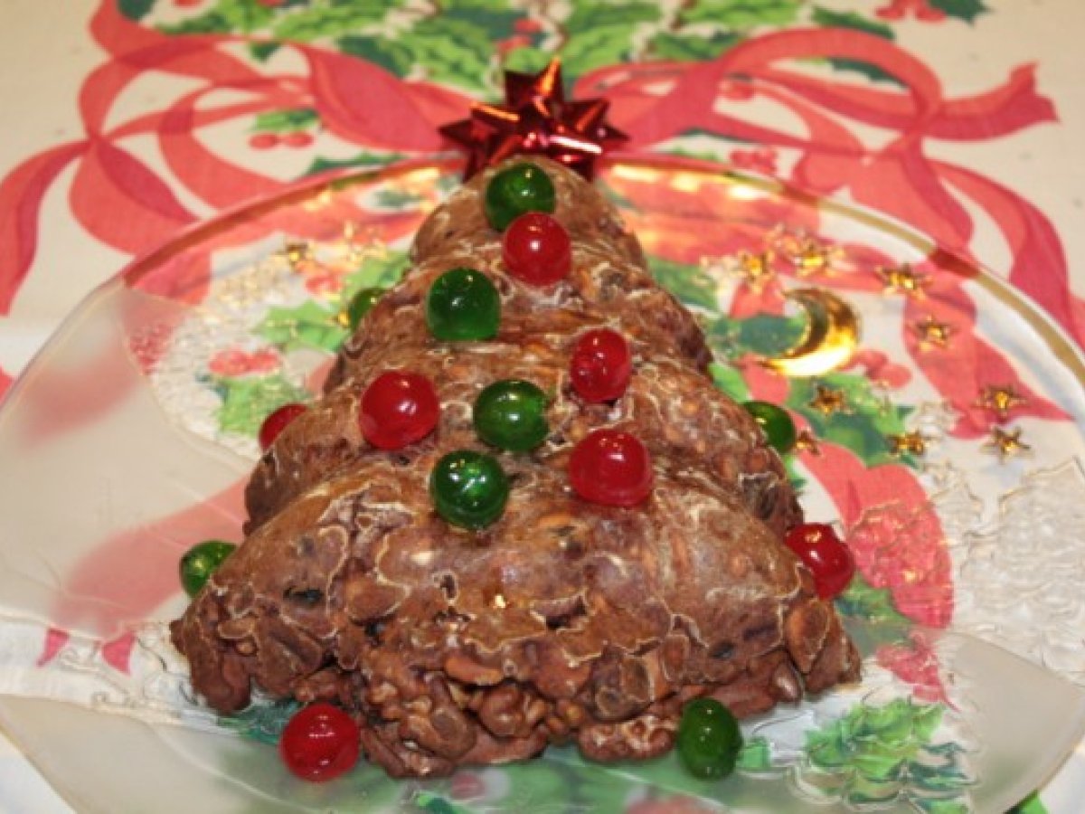 Albero di natale di frutta secca vota adesso PrecedenteProssimo Altrofacile1 h 20 m Invia questa ricetta ad un amico Stampa la ricetta Contatta l'autore della Ricetta Pubblica la foto di questa ricetta Ingredienti 4 250 gr di mandorle 100 gr di nocciole 200 gr di noci 100 gr di pinoli 60-70 gr di canditi 6-7 fichi secchi 4 manciate di uva passa fatta rinvenire nel rum 3-4 cucchiai di cacao amaro 4 cucchiai abbondanti di cannella 3 cucchiai di zucchero di canna 325 gr circa di miele 150 gr di farina un po’ di burro e farina per la teglia