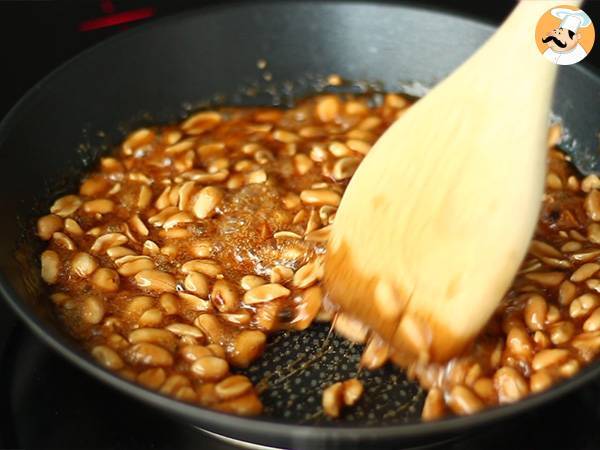 Mettete lo zucchero e l'acqua in una padella a fuoco medio. Quando si iniziano a vedere delle grosse bolle, aggiungete le arachidi e mescolate.