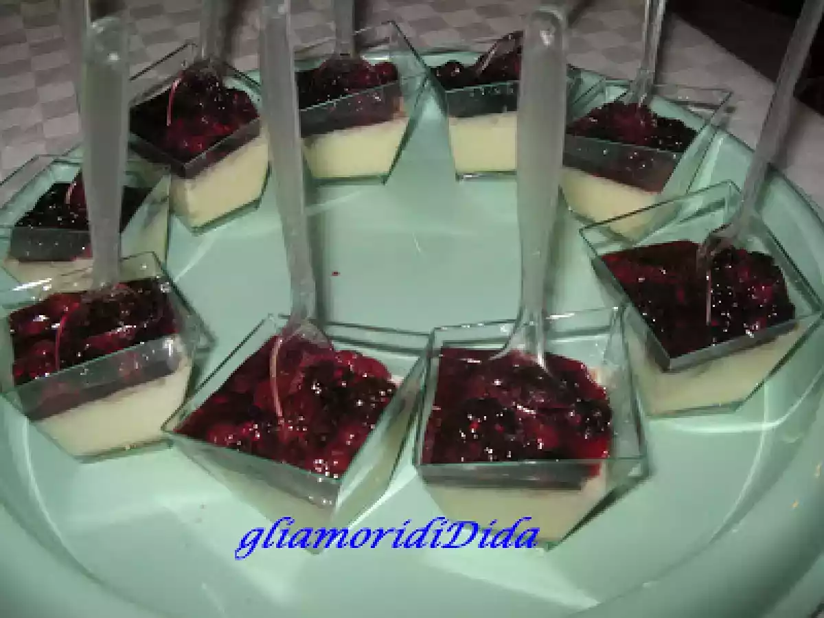 Bicchierini di panna cotta ai frutti di bosco e all'amaretto PrecedenteProssimo Altrofacile1 ora527 Kcal Invia questa ricetta ad un amico Stampa la ricetta Contatta l'autore della Ricetta Pubblica la foto di questa ricetta Ingredienti 5 500 ml di panna fresca 200 ml di latte intero 170 g di zucchero 1 bustina di vanillina 6 fogli di gelatina frutti di bosco zucchero di canna amaretti Costo stimato: 5.53Euros€ (1.11€/Porzioni)