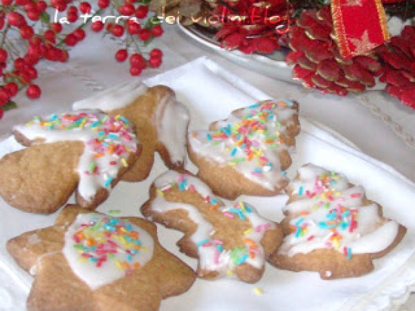 Biscotti miele e cannella Altrofacile40 min Invia questa ricetta ad un amico Stampa la ricetta Contatta l'autore della Ricetta Pubblica la foto di questa ricetta Ingredienti 3 1) 300 g farina 00 100 g di burro 2 uova 1 cucchiaio di miele 100 g di zucchero semolato 1/2 bustina di lievito Paneangeli 1 pizzico di sale 1 cucchiaino di cannella in polvere 2) Glassa Zucchero al velo Acqua bollente da versare pochissima alla volta codette colorate