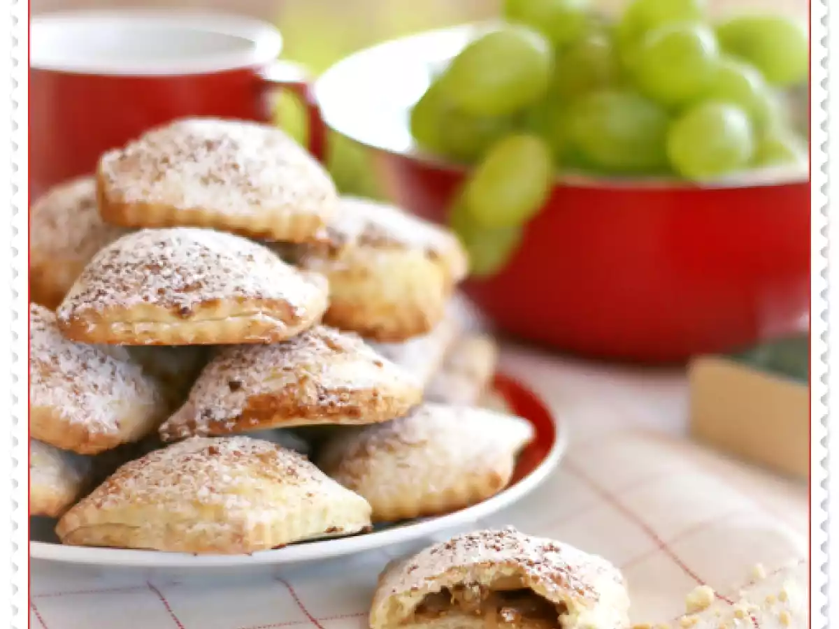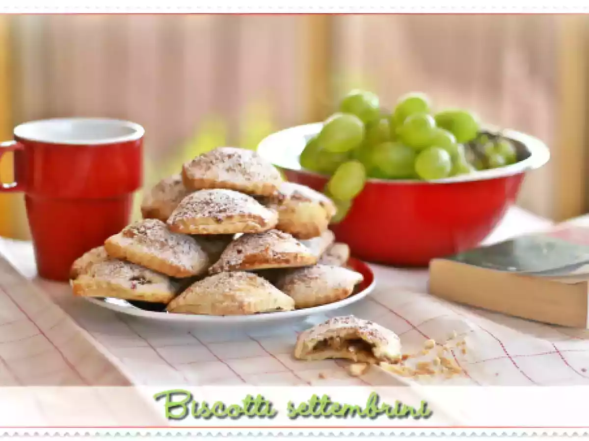 Biscotti settembrini PrecedenteProssimo Altrofacile42 min Invia questa ricetta ad un amico Stampa la ricetta Contatta l'autore della Ricetta Pubblica la foto di questa ricetta Questi biscotti sono davvero speciali. Provateli subito! Ingredienti 4 Per la pasta frolla: 250 g di farina 125 g di burro 125 g zucchero a velo 1 uovo intero 1 tuorlo buccia di limone Per il ripieno: 1 mela golden uva da schiacciata 2 fichi pinoli zucchero di canna 1 uovo