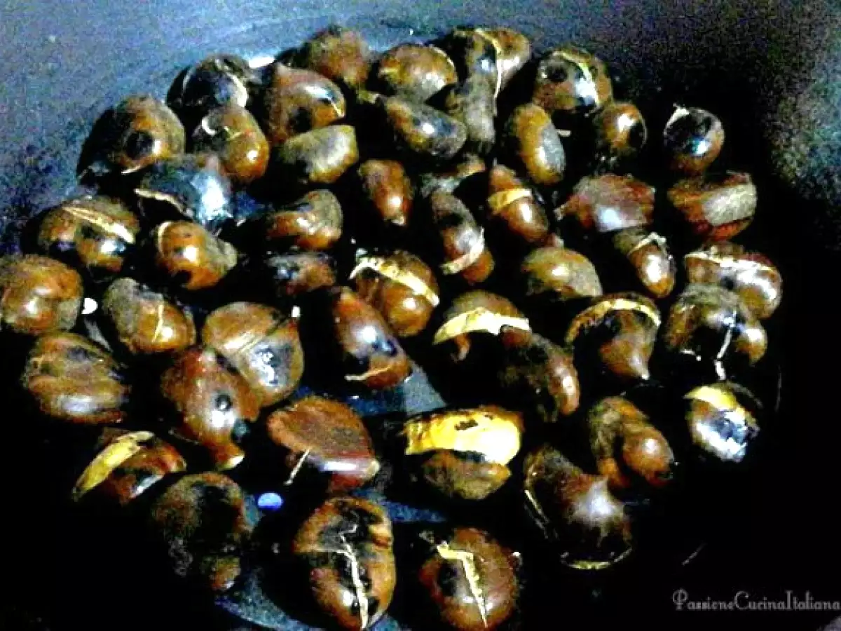 Controllate tutte le castagne e scartate quelle macchiate o che presentano buchini. - Con un coltello, o con l’apposito attrezzo, praticate su ogni castagna un’incisione lunga circa 2 centimetri che servirà per non farle scoppiare in cottura.