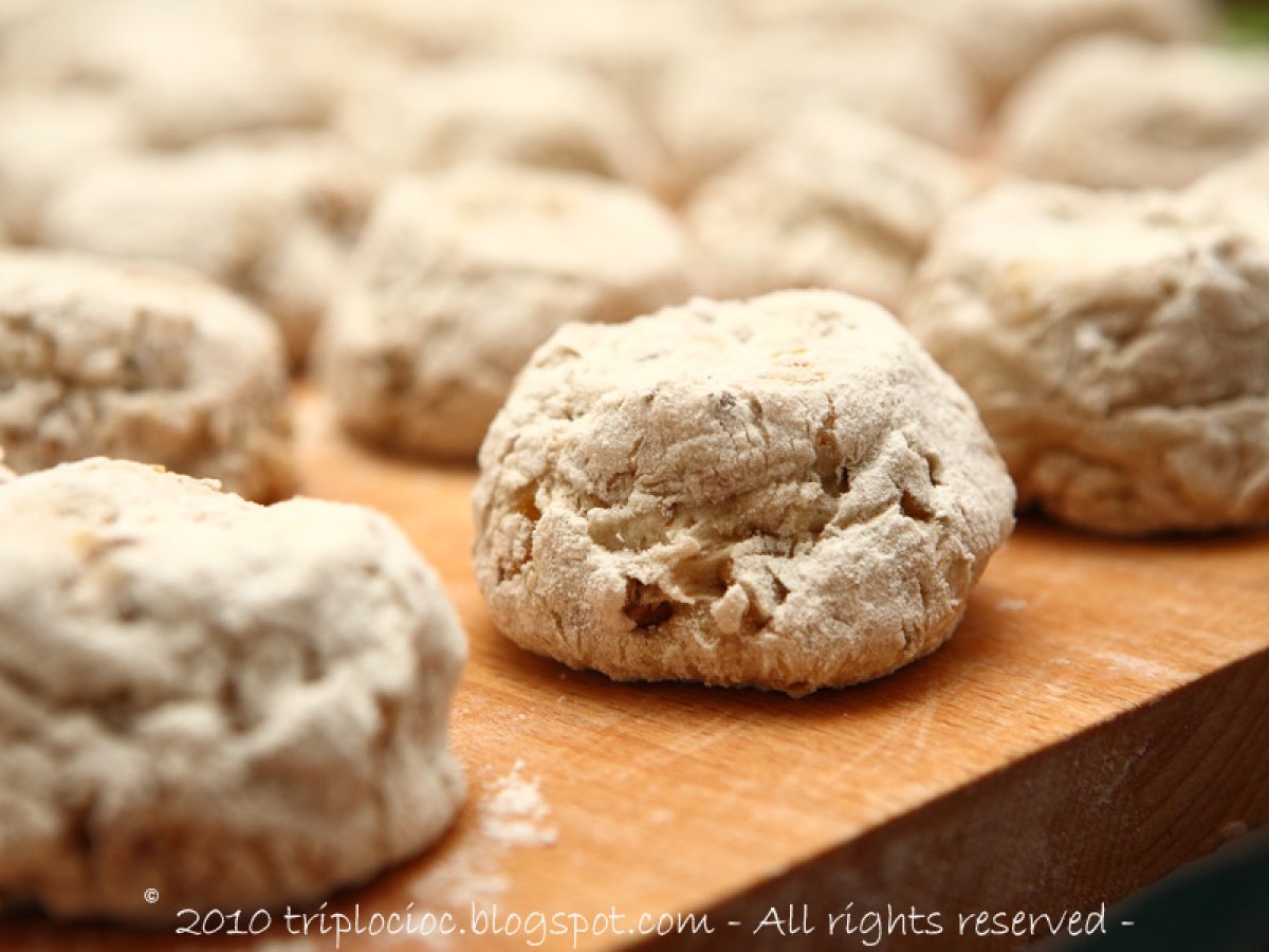 - A questo punto buttate in un colpo solo lo sciroppo sugli ingredienti secchi e girate il tutto velocemente formando una palla* che andrete immediatamente a trasferire sulla spianatoia dove la taglierete in più parti dalle quali ricaverete dei filoncini del diametro di circa 4 cm che poi andrete a tagliare in pezzetti alti circa 3 cm che appiattirete leggermente con una spatola o con le mani.