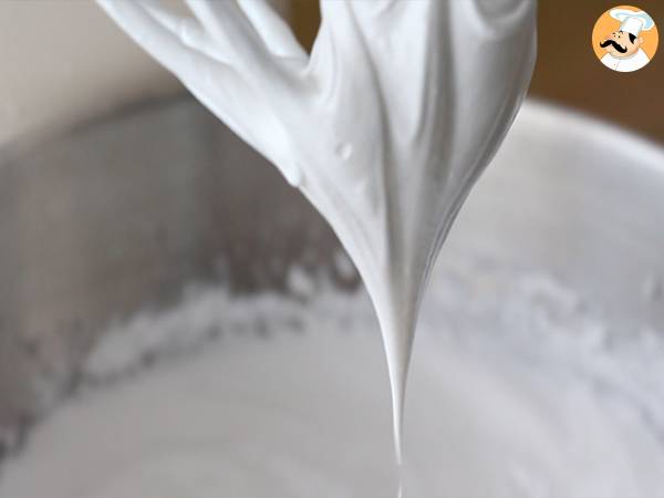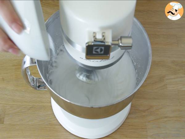 Iniziate a lavorare gli albumi con un po' di zucchero. Velocità bassa/media. Quando iniziano a montare aumentate la velocità del robot da cucina e incorporate lo zucchero, poco alla volta, fino a quando gli albumi saranno montati completamente.