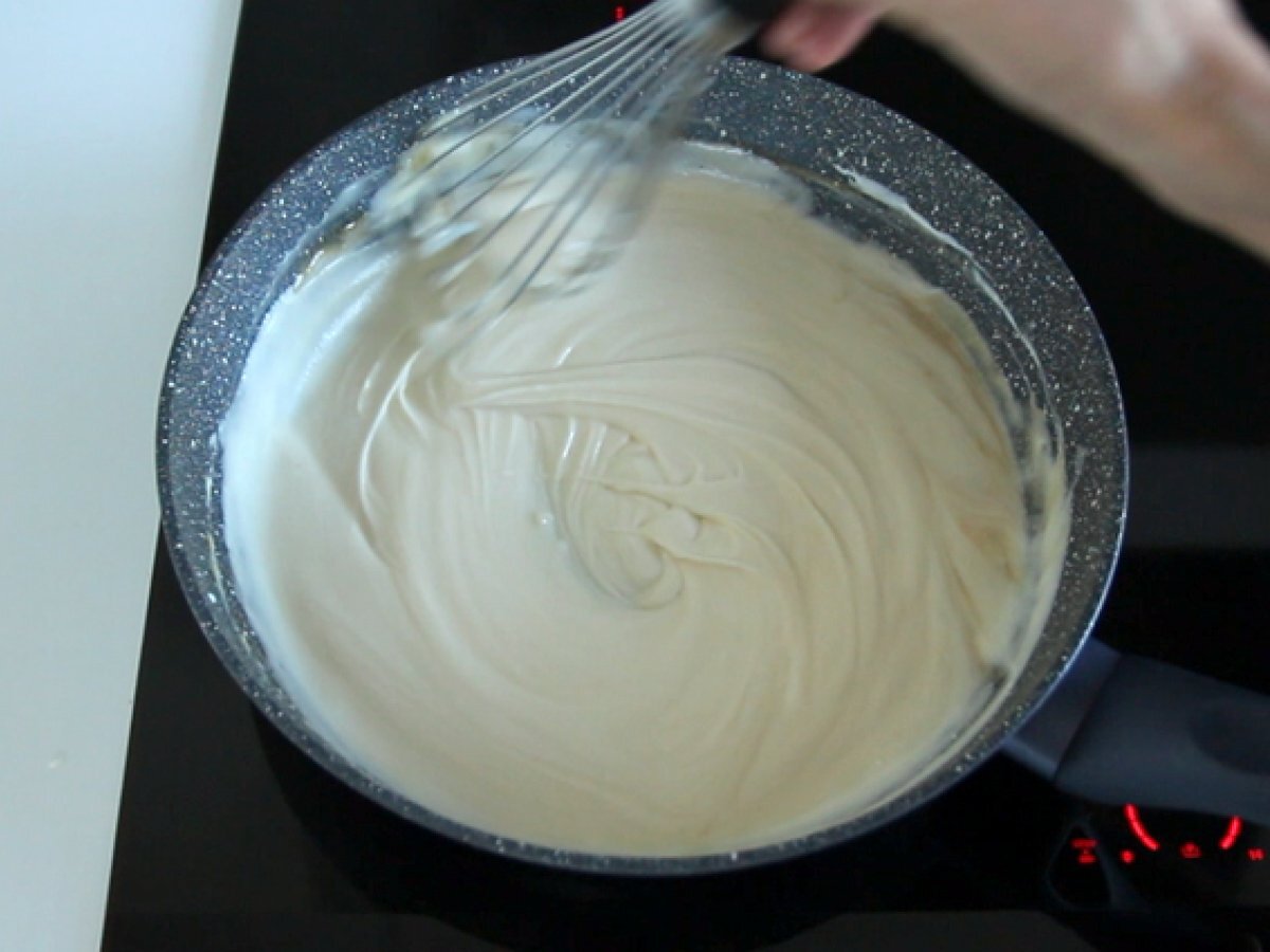 Sciogliete il burro in padella e aggiungete la farina. Mescolate e lasciate cuocere per 2 minuti.