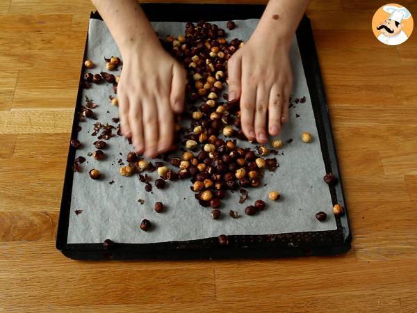 Lasciate che le nocciole si raffreddino (circa 15 minuti), poi sfregatele tra le mani per eliminare la buccia. Sciogliete il cioccolato al latte.