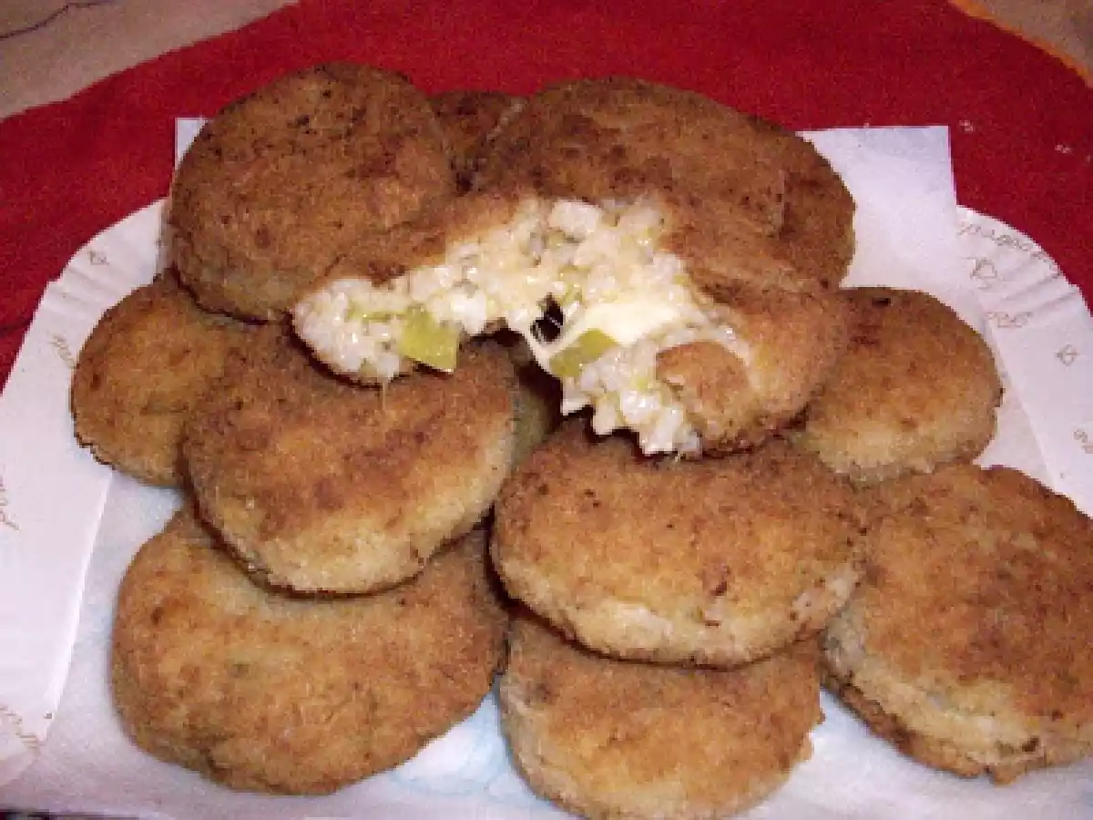 Crocchette di riso e porri vota adesso Altrofacile45 min Invia questa ricetta ad un amico Stampa la ricetta Contatta l'autore della Ricetta Pubblica la foto di questa ricetta Ingredienti 5 5 pugni di riso arborio 2 porri 2 cucchiai di passato di pomodoro Olio extravergine di oliva Sale 80 g grana grattugiato 100 g di fontina 3 albumi Pane grattugiato e farina q.b Olio per friggere q.b