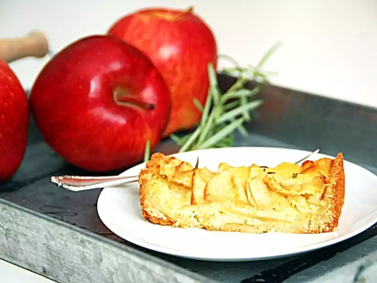 Crostata di mele al rosmarino (knam) PrecedenteProssimo Altrofacile1 h 15 m Invia questa ricetta ad un amico Stampa la ricetta Contatta l'autore della Ricetta Pubblica la foto di questa ricetta Ingredienti 8 600 g di pasta frolla 2 mele 400 g di crema frangipane rosmarino tritato 50 g di gelatina in polvere burro e farina per lo stampo rametti di rosmarino per la decorazione Pasta frolla : 150 g di burro 150 g di zucchero semolato 1 uovo vaniglia in polvere 6 g di lievito in polvere 300 g di farina 00 un pizzico di sale Crema frangipane : 100 gr farina di mandorle 100 gr burro morbido 100 gr zucchero 30 gr farina 00 1 uovo 1 cucchiaio Calvados