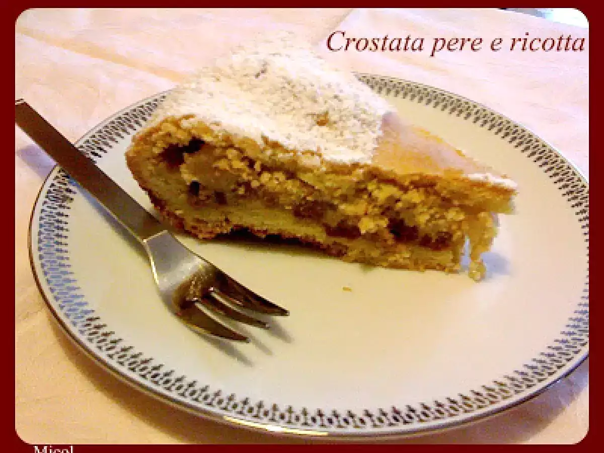 Crostata di pere e ricotta alla cannella Altrofacile1 h 10 m1281 Kcal Invia questa ricetta ad un amico Stampa la ricetta Contatta l'autore della Ricetta Pubblica la foto di questa ricetta Ingredienti 4 Per la pasta frolla : 500 g farina 200 g zucchero 200 g burro 1 bustina di lievito 2 uova Per il ripieno : 250 g ricotta 2 pere 100 g zucchero 1 cucchiaino di cannella Costo stimato: 4.88Euros€ (1.22€/Porzioni)