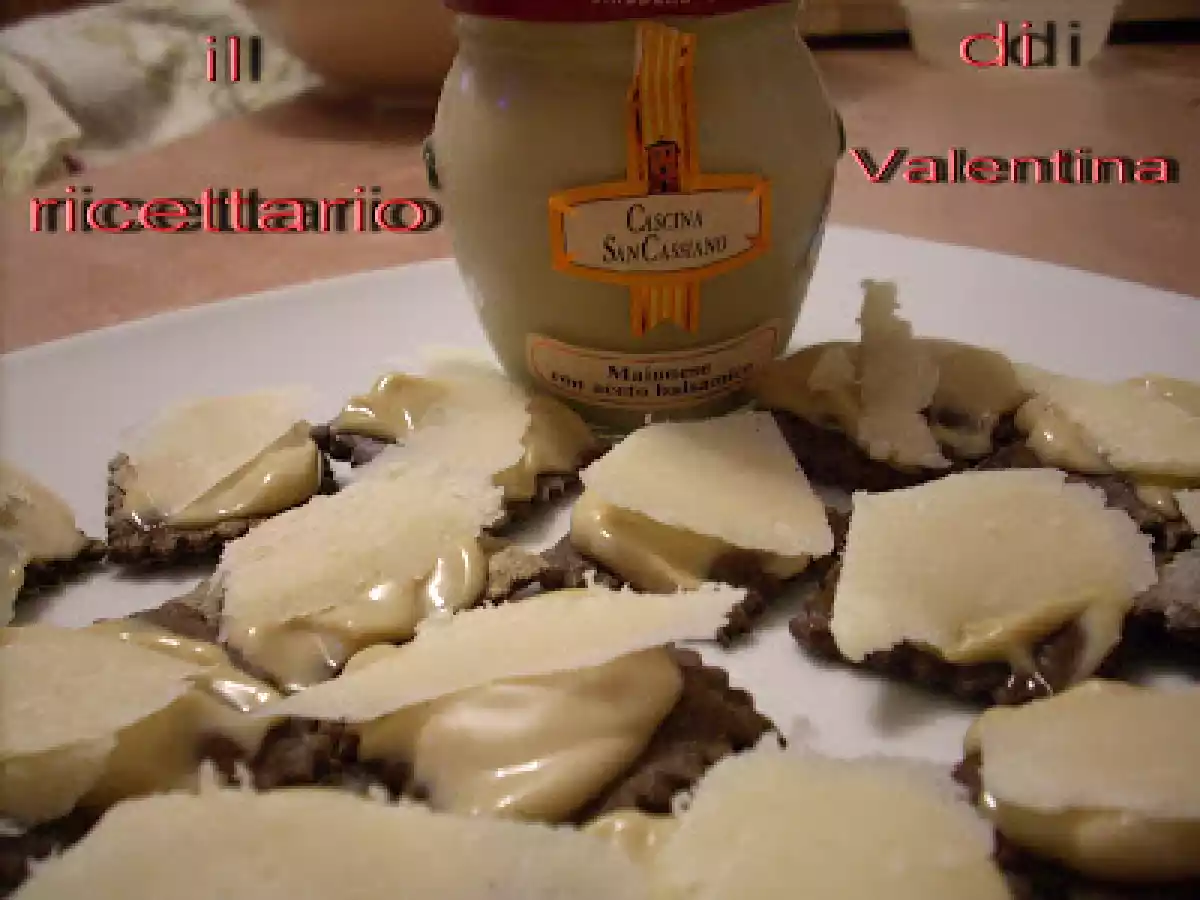 Crostini alle olive con maionese all'aceto balsamico e scaglie di grana