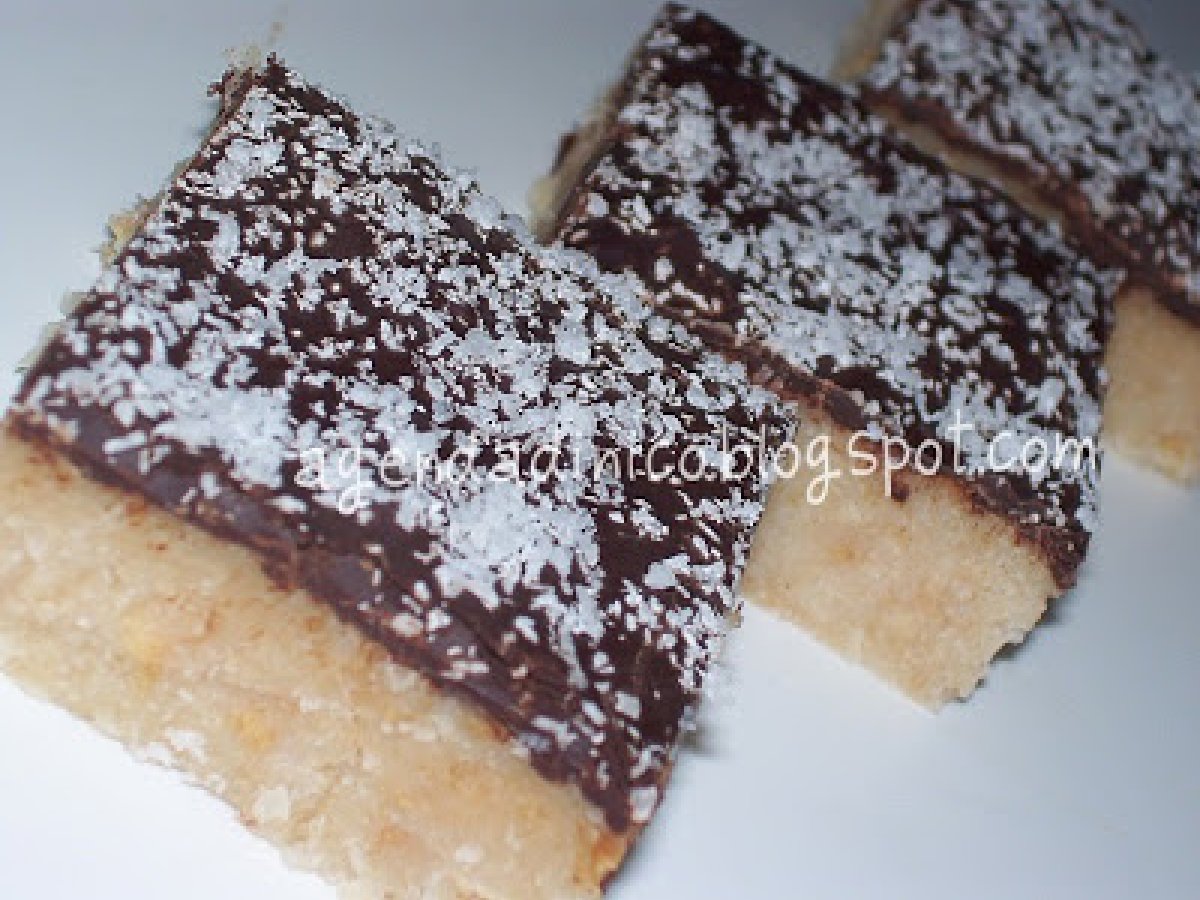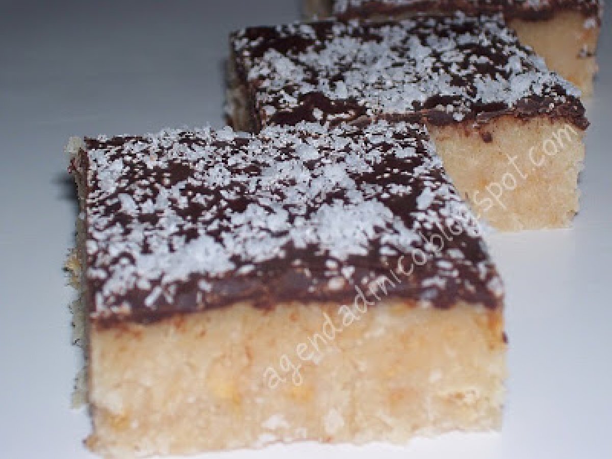 Dolce al cocco e cioccolato / prajitura cu cocos si ciocolata PrecedenteProssimo Altrofacile1 ora894 Kcal Invia questa ricetta ad un amico Stampa la ricetta Contatta l'autore della Ricetta Pubblica la foto di questa ricetta Ingredienti 5 250 g di cocco macinato 150 g di biscotti secchi 150 g di burro un bicchiere di latte 150 g di zucchero 200 g di cioccolato fondente Costo stimato: 5.57Euros€ (1.11€/Porzioni)
