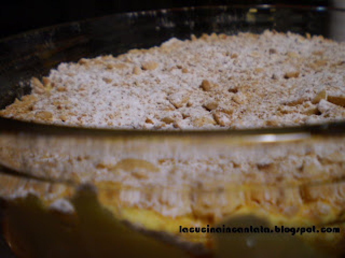 montare i tuorli con lo zucchero e unire gli albumi,aggiungere il mascarpone e mescolare per bene. - Mettere meta' del composto in una pirofila,lisciare bene e metterci sopra buona parte degli amaretti sbriciolati il caffe' e il liquore in maniera uniforme. coprire per bene con l'altra meta' lisciare di nuovo e metterci sopra le mandorle tritate grossolanamente e il resto degli amaretti.cospargere con zucchero a velo e mettere in frigorifero fino al momento di servire.