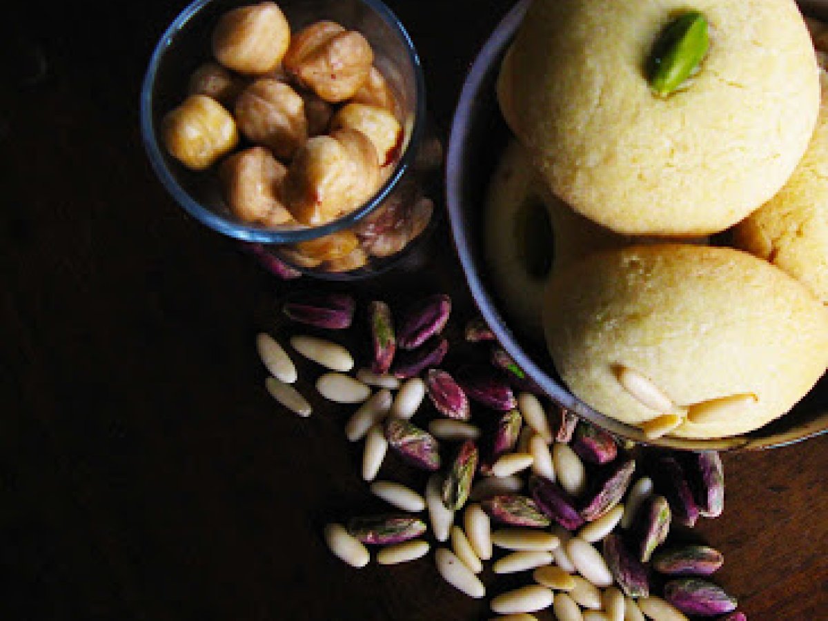 Dolcetti arabi (ghorayebah) PrecedenteProssimo Altrofacile55 min Invia questa ricetta ad un amico Stampa la ricetta Contatta l'autore della Ricetta Pubblica la foto di questa ricetta Ingredienti 4 burro 250 g farina 300 g zucchero 100 g nocciole spellate 80/100 g pistacchi sbucciati e pinoli una manciata