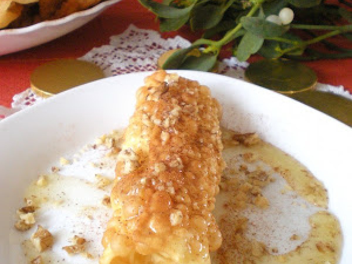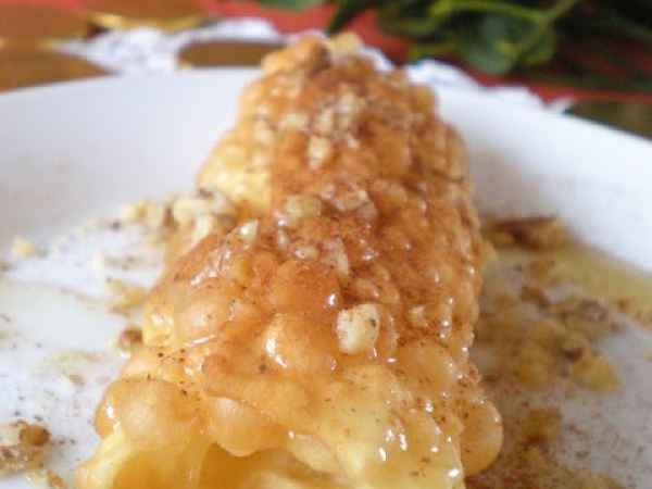 Dolci delle feste : le diples PrecedenteProssimo Altrofacile50 min688 Kcal Invia questa ricetta ad un amico Stampa la ricetta Contatta l'autore della Ricetta Pubblica la foto di questa ricetta Ingredienti 4 250 g di farina 2 uova ½ cucchiaio di zucchero ½ cucchiaino scarso di bicarbonato 1 pizzico di sale 1 cucchiaino succo di limone ½ bicchierino di liquore ouzo, o sambuca o grappa olio per friggere per lo sciroppo: ½ bicchiere di miele 1 bicchiere di zucchero 1 bicchiere di acqua qualche goccia di limone noci tritate e cannella in polvere per guarnire Costo stimato: 3.51Euros€ (0.88€/Porzioni)