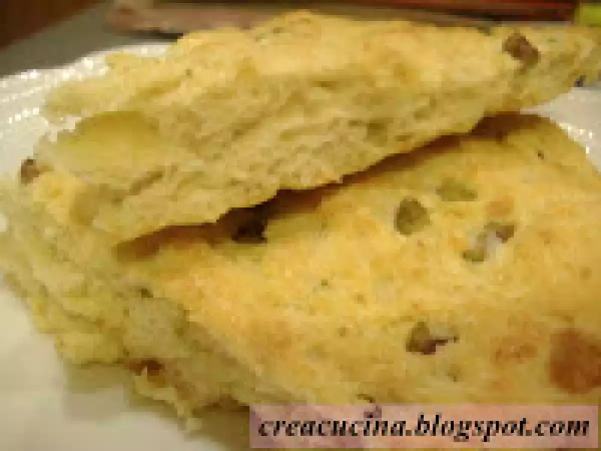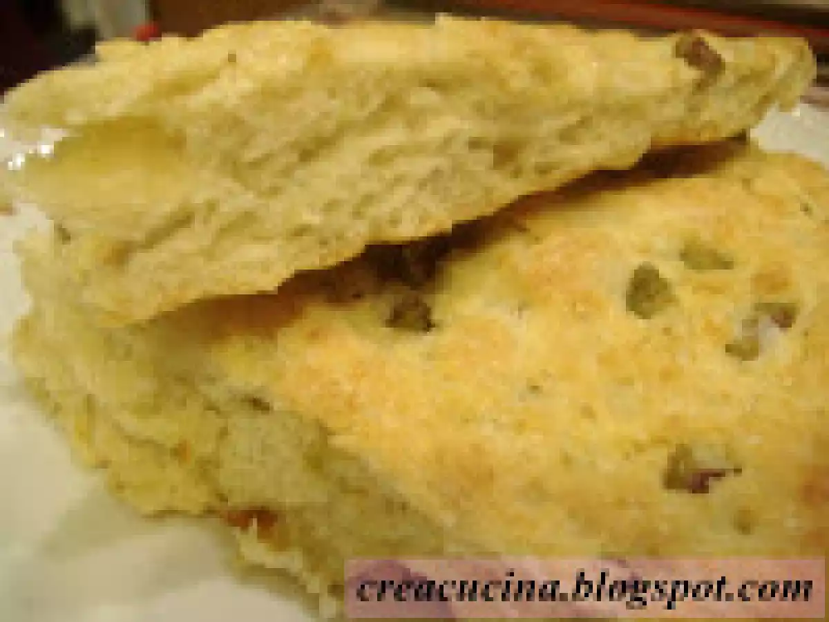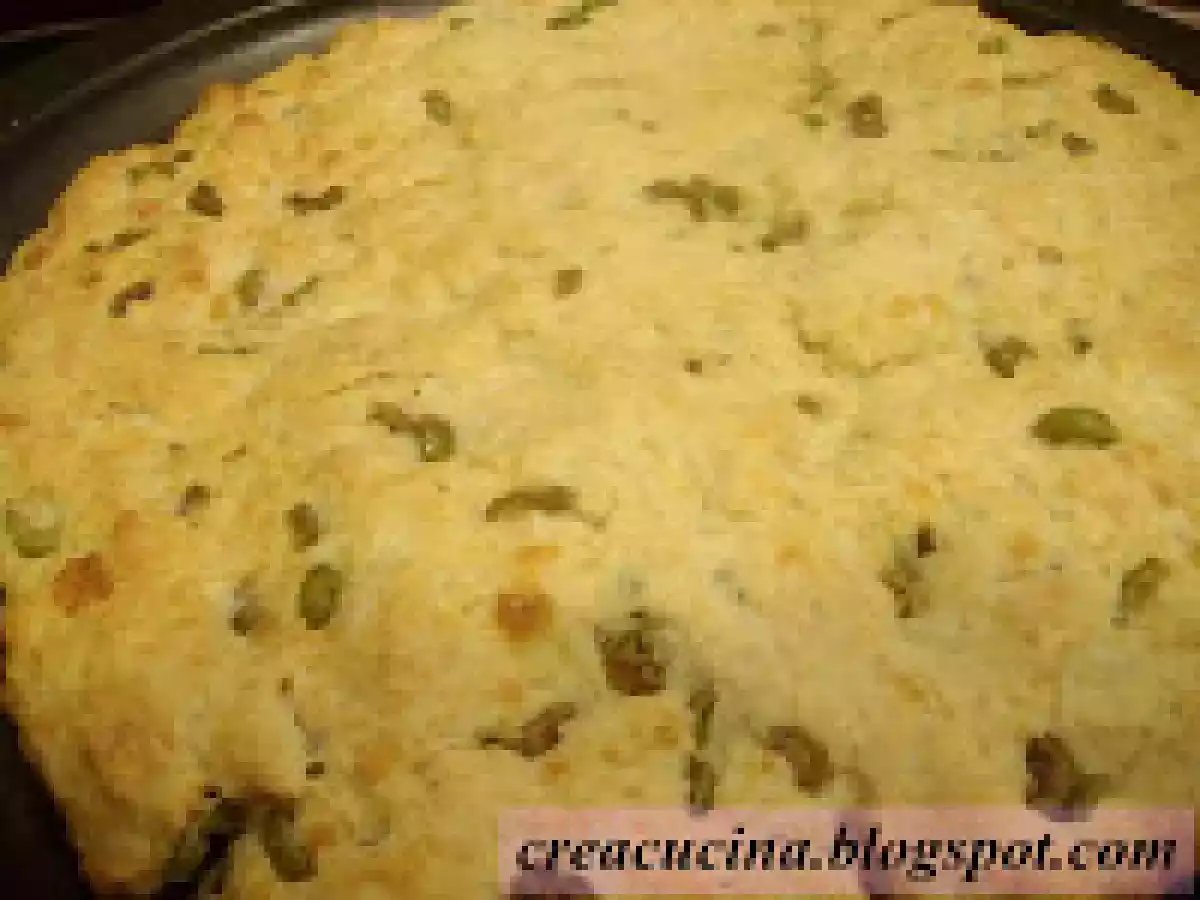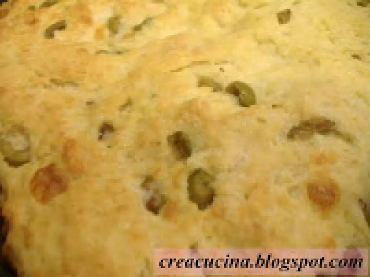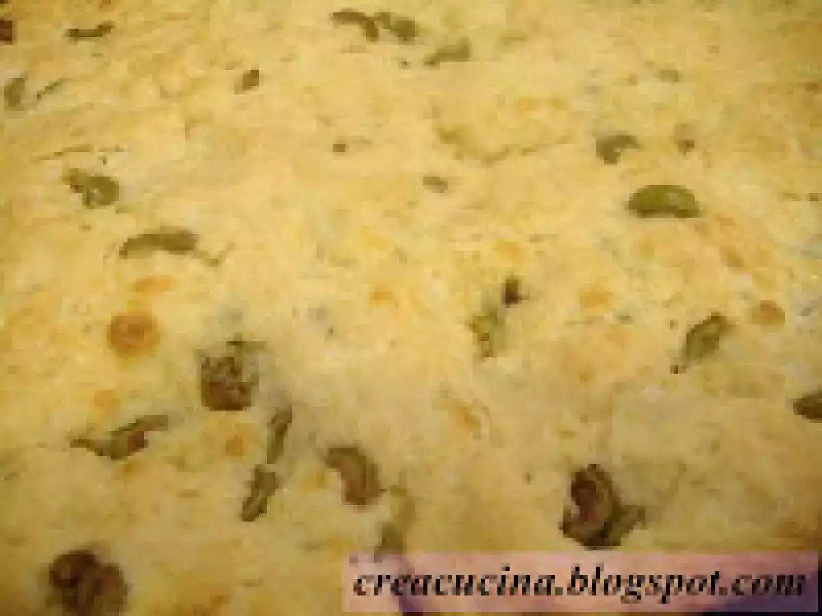 Focaccia alle olive e mozzarella (superveloce) PrecedenteProssimo Altromedia50 min Invia questa ricetta ad un amico Stampa la ricetta Contatta l'autore della Ricetta Pubblica la foto di questa ricetta Ingredienti 6 400 g di farina Manitoba 250 ml di acqua fredda 125 g di mozzarella tagliata a dadini piccoli 70 g di olive verdi tagliate a pezzetti 1 cucchiaio di fiocchi di patate 1 cucchiaino di zucchero 2 cucchiaini di sale una bustina di polvere lievitante "Pizzaiolo" Paneangeli olio di oliva