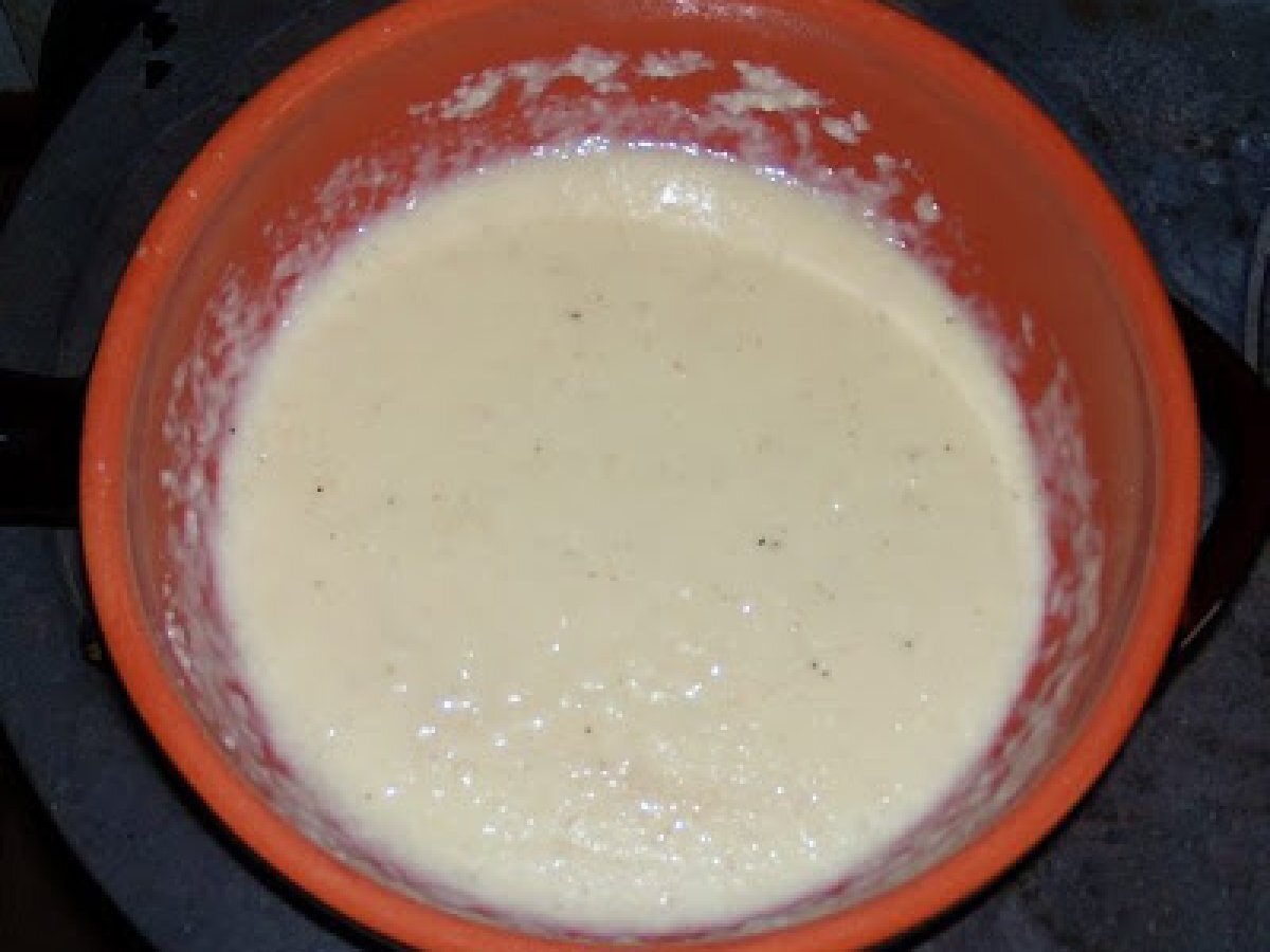 - Trascorse le due ore, mettere sul fuoco basso la pentola e, dopo aver aggiunto il grana grattugiato, mescolare il tutto continuamente con una frusta metallica o un mestolo di legno, fino a che il formaggio non sia completamente fuso.