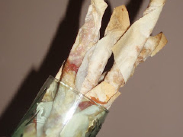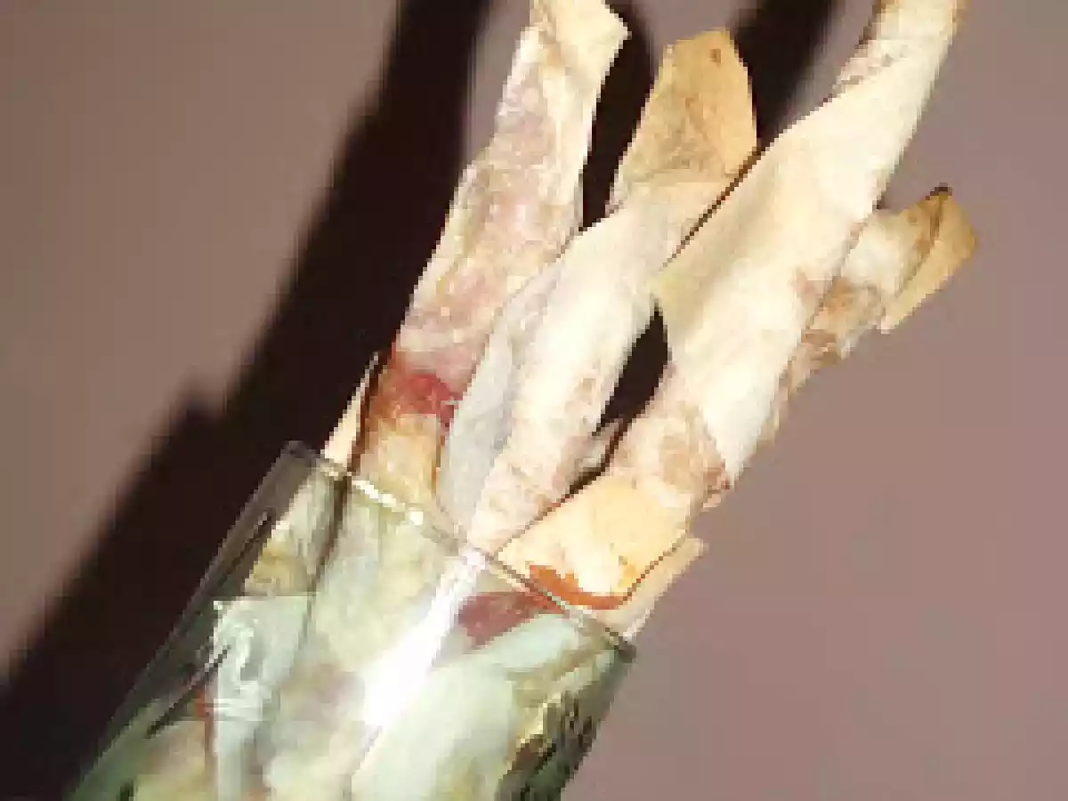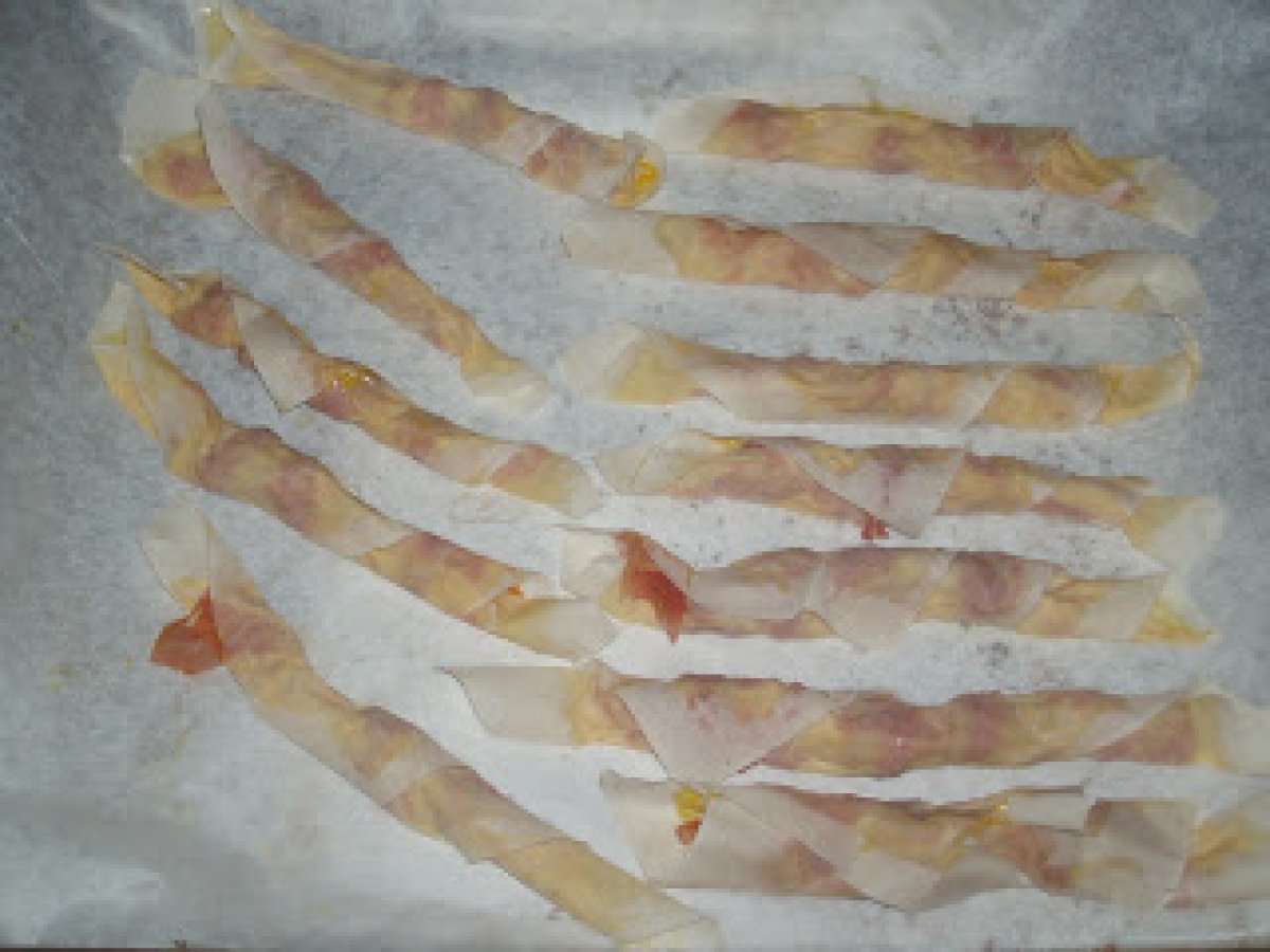 - Tagliare a filanger il prosciutto, pennellare la pasta con l'uovo, cospargere un po' di prosciutto e arrotolare in diagonale creando dei sigari, porre in una teglia coperta da carta da forno.