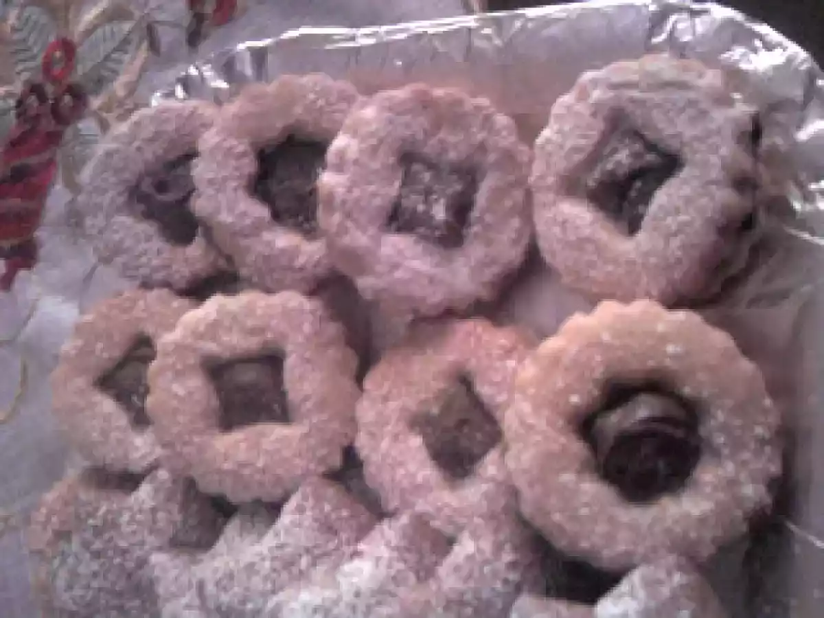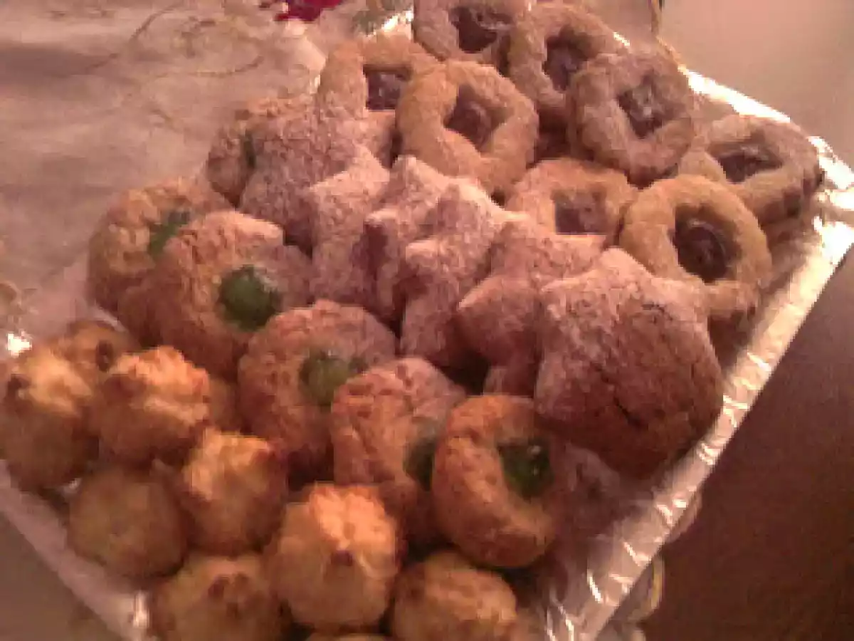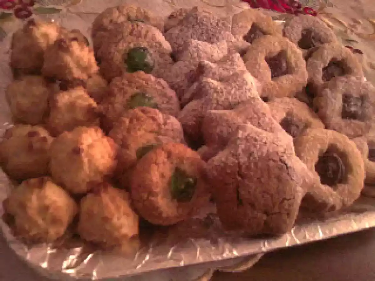 Joyeux noël..biscottini al cocco, biscotti alle mandorle PrecedenteProssimo Altrofacile1 h 40 m Invia questa ricetta ad un amico Stampa la ricetta Contatta l'autore della Ricetta Pubblica la foto di questa ricetta Ingredienti 10 IL BUCCELLATO : per il biscotto : 500 g di farina 00 150 g di zucchero 100 g di margarina 10 g di ammoniaca o 1/2 cucchiaino di lievito per dolci latte qb per ottenere un impasto morbido ma elastico per il ripieno : 250 g di fichi secchi 100 g di mandorle tostate 100 g di uva sultanina un pizzico di cannella scorza di 2 arance grattugiate 3 cucchiai di miele 2 cucchiai di marmellata di fichi 20 g di frutta candita o zuccata GLI OCCHI DI BUE : 190 g di burro 125 g di zucchero 325 g di farina 1 uovo intero 2 tuorli vanillina e scorza di limone q.b. I BISCOTTI SPEZIATI : 500 g di farina 00 125 g di burro 125 g di zucchero 250 g di miele 1 uovo grande un cucchiaino di bicarbonato 10 g di cacao amaro un cucchiaino colmo di cannella un cucchiaino di zenzero SIMIL PASTE DI MANDORLA : 100 g di farina di mandorla 100 g di zucchero 2 albumi ciliegie candite CIUFFETTI AL COCCO : 100 g di farina di cocco 100 g di zucchero 4 cucchiai di farina 3 albumi