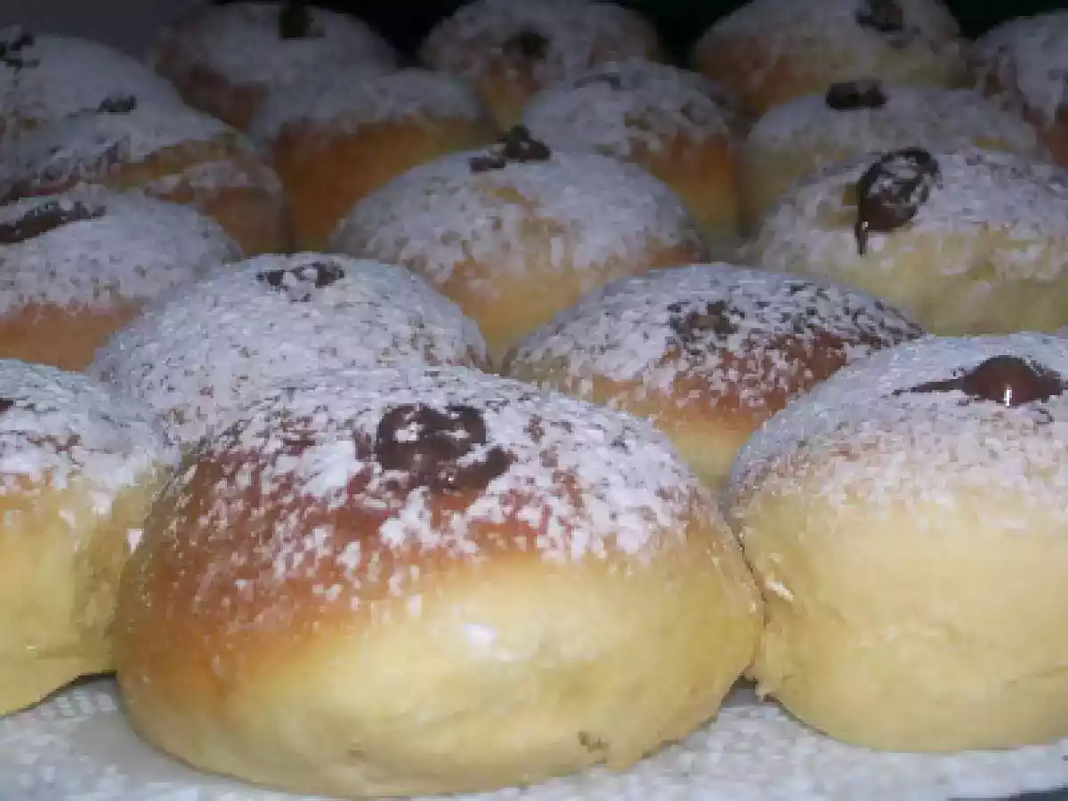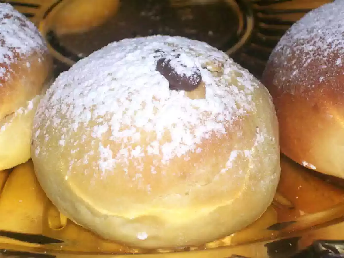 Krapfen (o bomboloni) al forno PrecedenteProssimo Altrofacile45 min1050 Kcal Invia questa ricetta ad un amico Stampa la ricetta Contatta l'autore della Ricetta Pubblica la foto di questa ricetta Ingredienti 3 300 g farina 00 200 g manitoba 200 g latte 100 g zucchero a velo 60 g burro 3 tuorli 25 g lievito di birra scorza grattugiata di limone o arancia 1 b. vanillina 3 pizzia sale zucchero a velo per decorare nutella per farcire