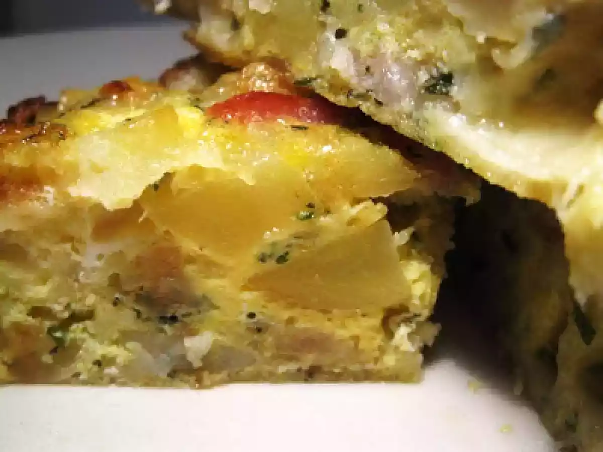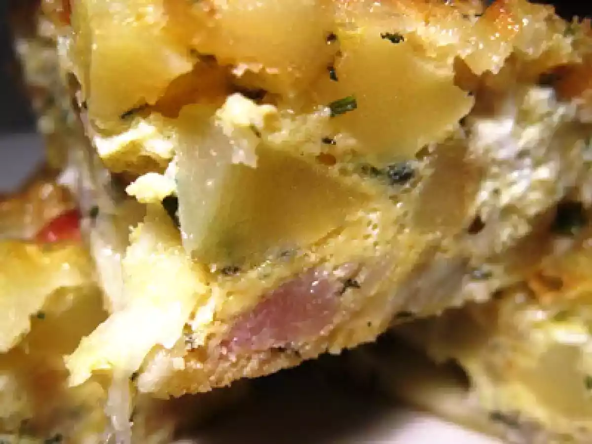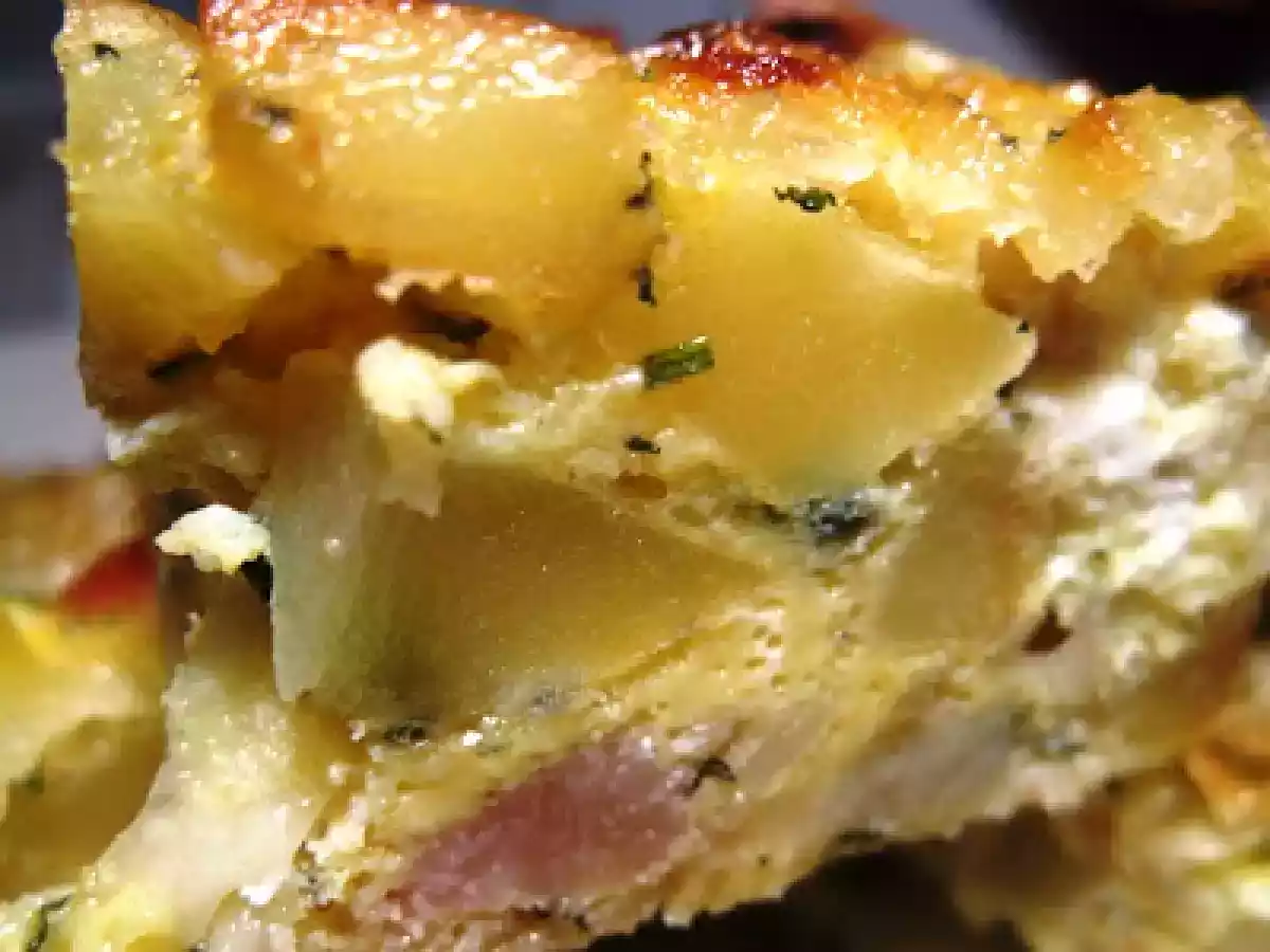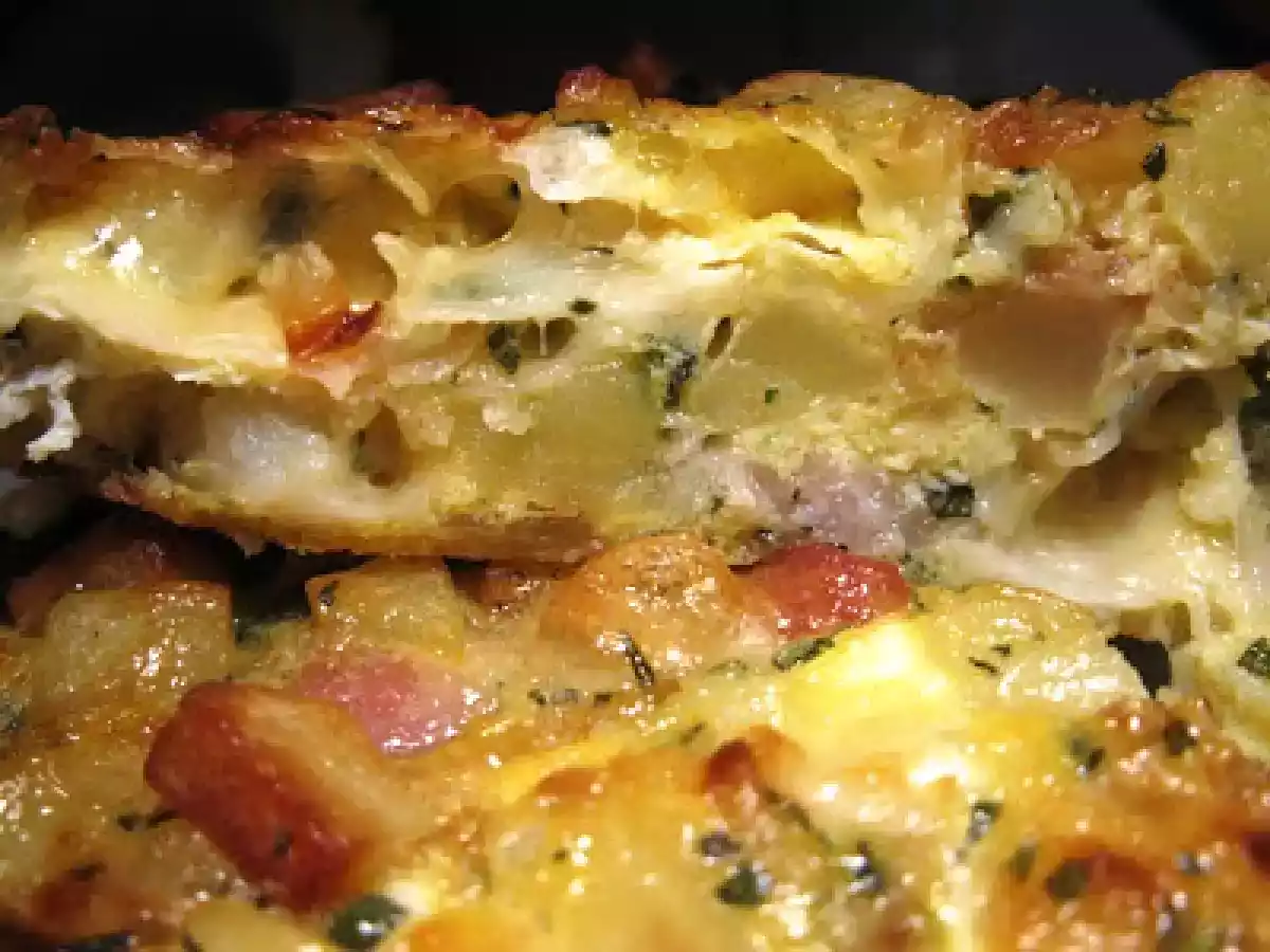 La frittata alla savoiarda vota adesso PrecedenteProssimo Altromedia40 min Invia questa ricetta ad un amico Stampa la ricetta Contatta l'autore della Ricetta Pubblica la foto di questa ricetta Ingredienti 2 2 patate medie tagliate a cubetti 35 g di lardo anche quello a cubetti 1/2 cipolla media 3 foglie di salvia 1 rametto di rosmarino 2 uova 60 g di Emmetaler a cubetti Sale e pepe q.b. Uno degli elementi base è l'Emmentaler
