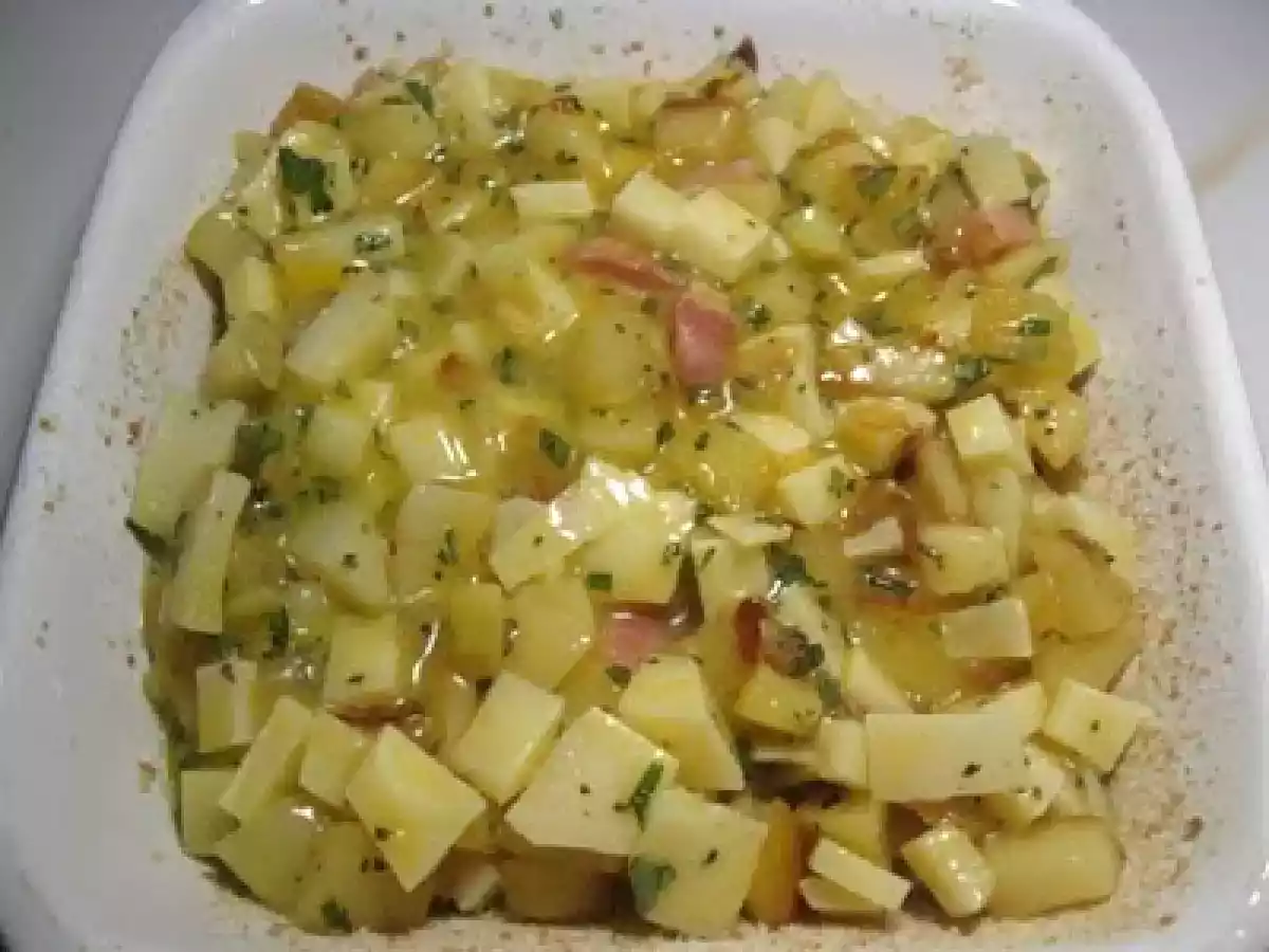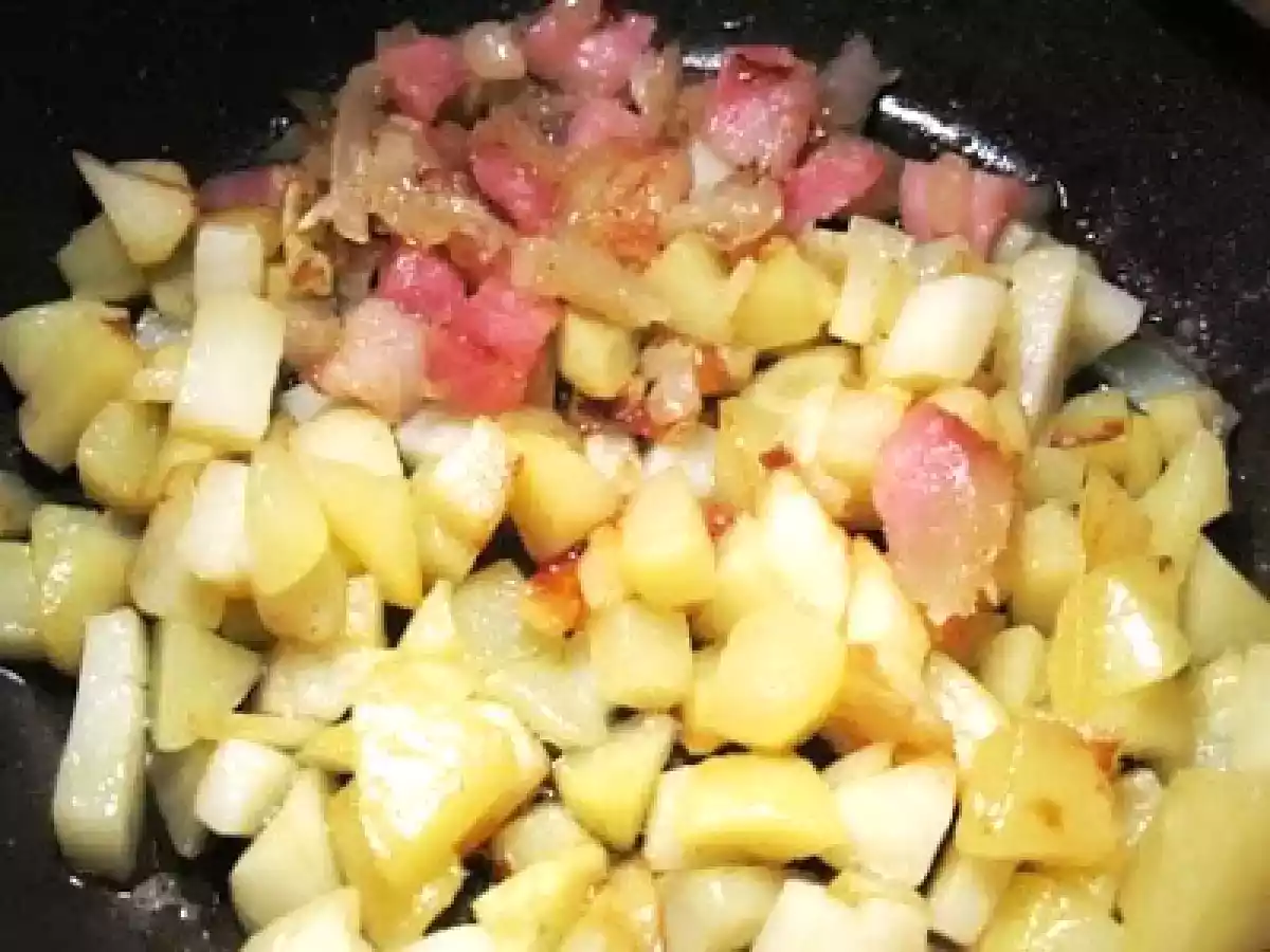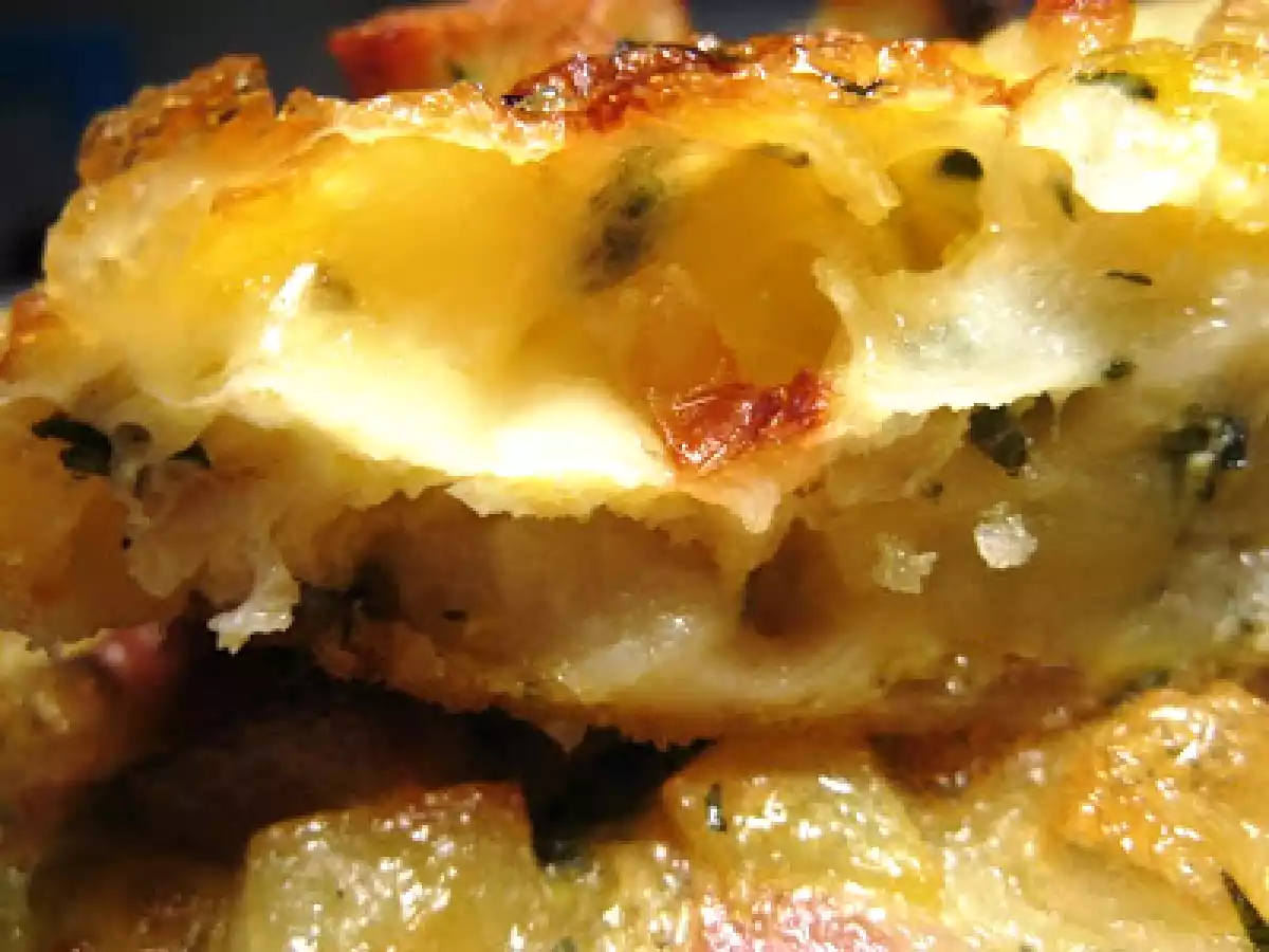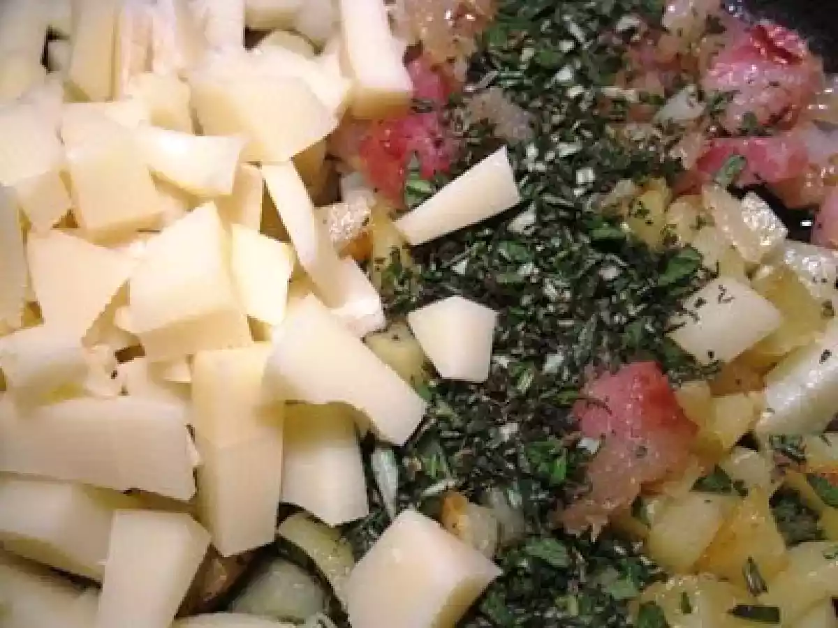 La frittata alla savoiarda vota adesso PrecedenteProssimo Altromedia40 min Invia questa ricetta ad un amico Stampa la ricetta Contatta l'autore della Ricetta Pubblica la foto di questa ricetta Ingredienti 2 2 patate medie tagliate a cubetti 35 g di lardo anche quello a cubetti 1/2 cipolla media 3 foglie di salvia 1 rametto di rosmarino 2 uova 60 g di Emmetaler a cubetti Sale e pepe q.b. Uno degli elementi base è l'Emmentaler