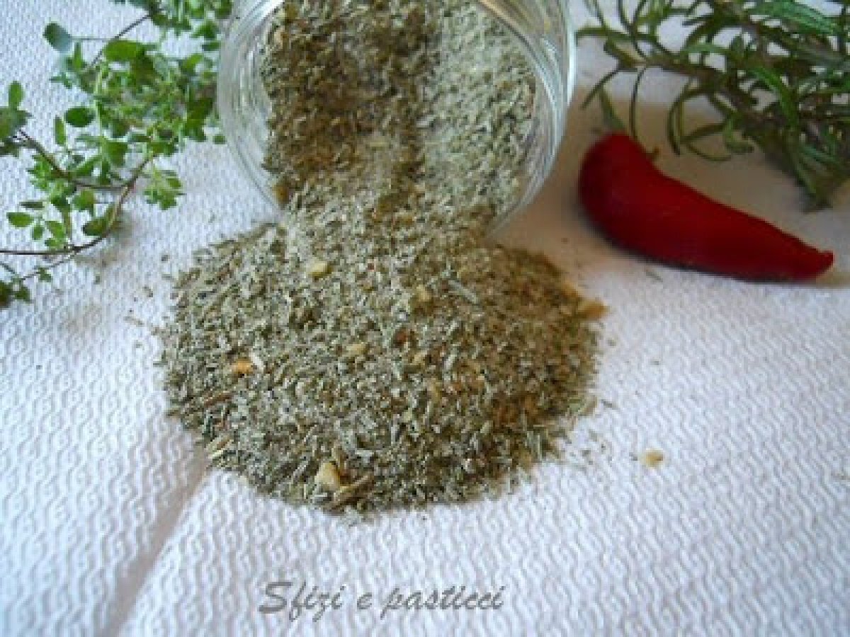 - Una volta secche, mettere tutti gli aromi all'interno del robot, aggiungere un poco di aglio e peperoncino secco a piacere, tritare fino ad ottenere quasi una polvere.