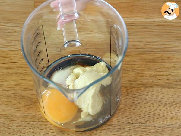 Ora con un mixer ad immersione mescolate il composto e allo stesso tempo incorporate, a filo, l'olio di semi fin quando non raggiungerete la consistenza desiderata.