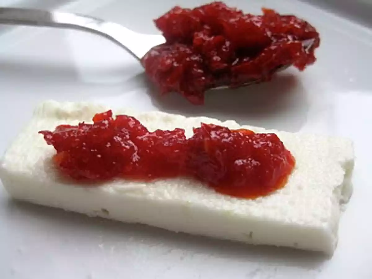 - Lavare i peperoncini, privarli dei semi tagliarli in piccoli pezzi ,metterli sul fuoco insieme a fruttapec 2:1 e lo zucchero, portare ad ebollizione e far bollire per 3 minuti circa.