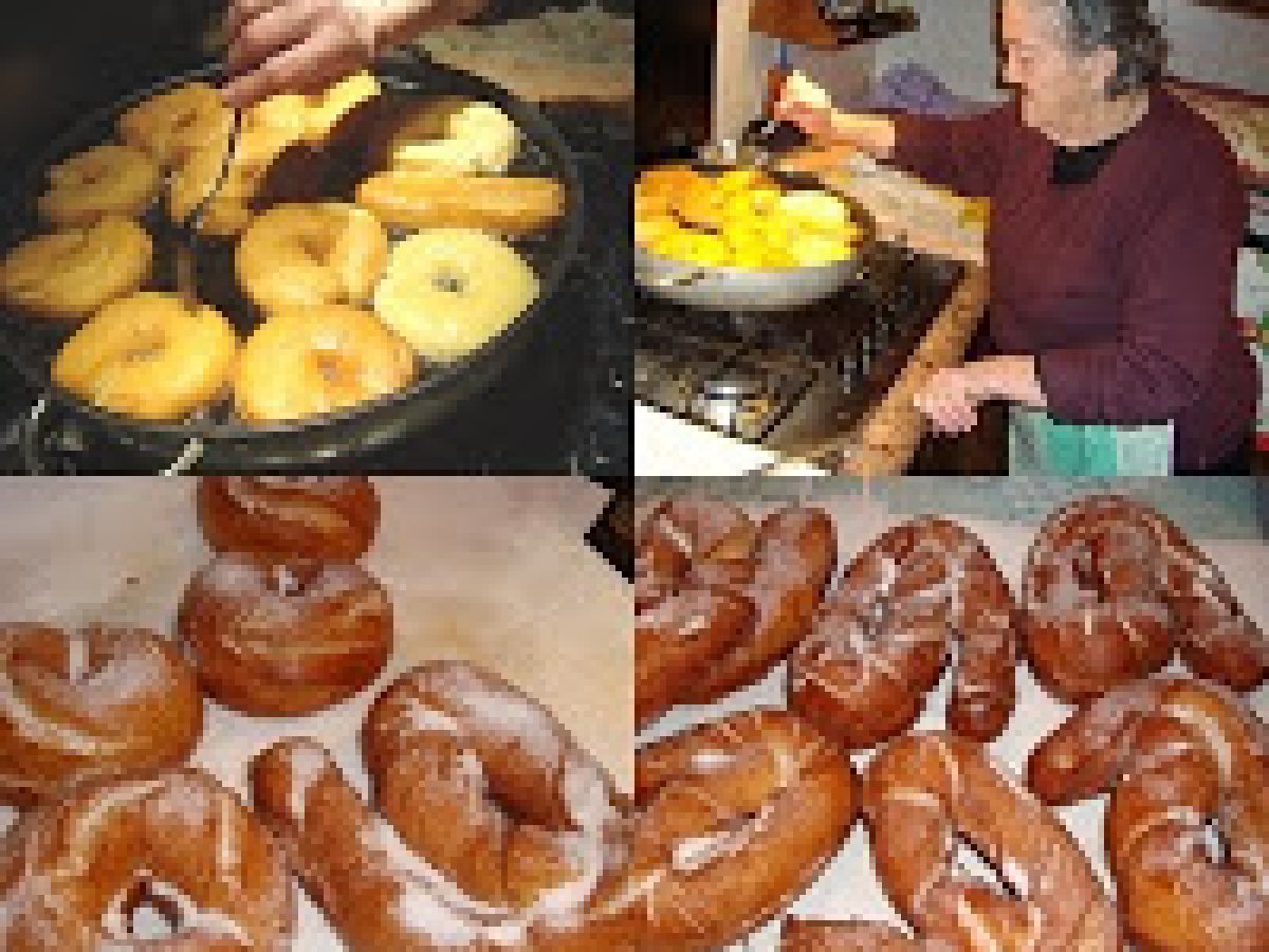 - Se le forme sono raddoppiate di volume..si possono iniziare a friggere.Vi ricordate i gnocchetti di prova. Bene questo è un trucchetto della Nonna Pina. Lei prepara queste forme in modo che il mattino del 5° giorno..mette in un pentolino dell'acqua e quando questa inizia a prendere bollore immerge i famosi gnocchetti se vengono subito a galla,vuol dire che la pasta è ben lievitata e quindi si possono friggere. Dopo fritte si fa assorbire l'olio in eccesso e si cospargono di zucchero. Questa è la mia Nonnina che frigge le nacatole.
