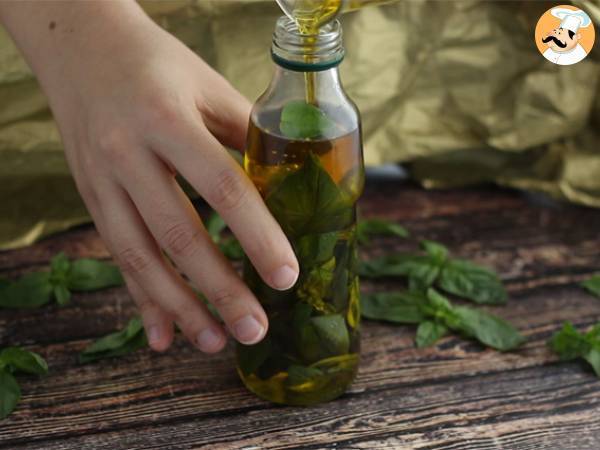 Prendete la bottiglia e mettete all'interno le foglie di basilico. Versate l'olio d'oliva all'interno e tappate.