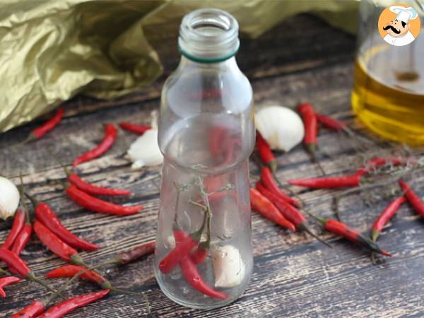 La bottiglia : Potete utilizzare una bottiglia di olio già piena e aggiungere gli ingredienti della ricetta. Nel caso fosse piena fino all'orlo, svuotatela un po' prima di mettere l'aglio, i peperoncini ed il timo.