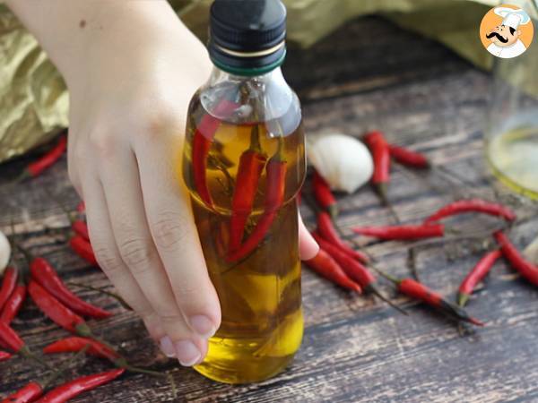 Ora riempite la bottiglia con l'olio d'oliva e chiudetela. Lasciate in macerazione per almeno 30 giorni in un luogo secco e buio.