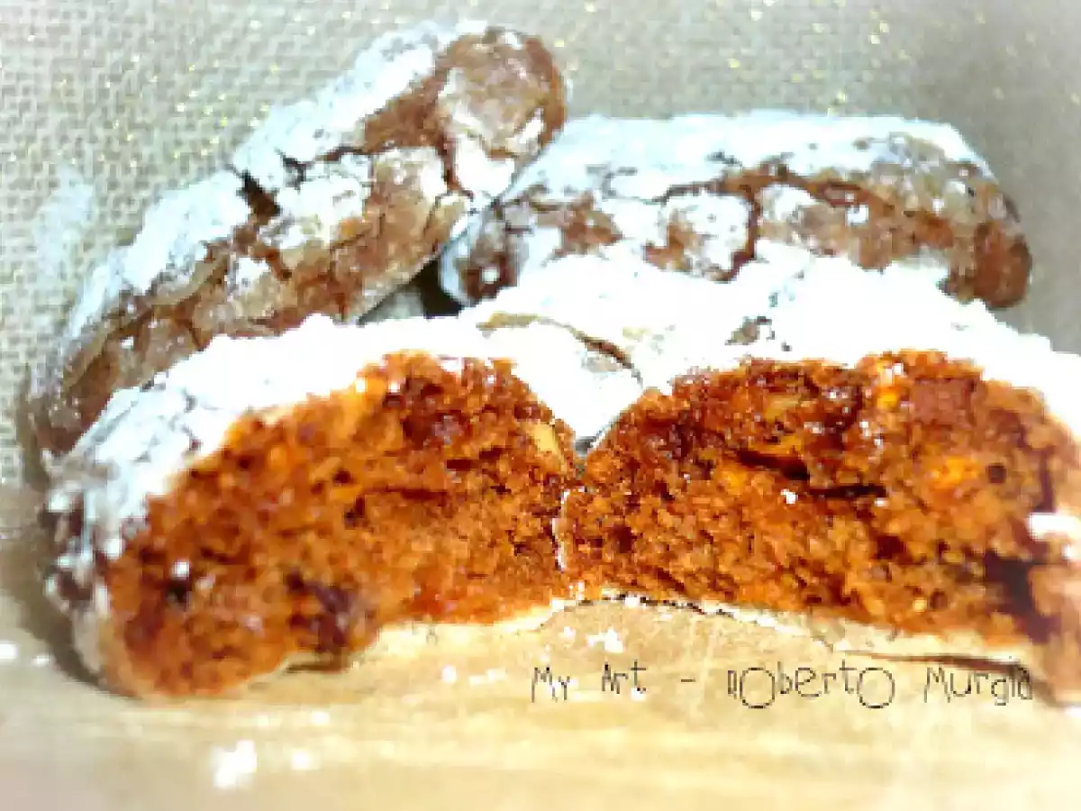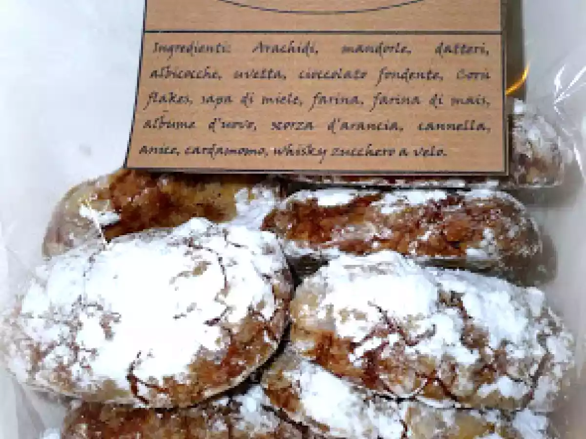 Pan d'egitto PrecedenteProssimo Altrofacile50 min Invia questa ricetta ad un amico Stampa la ricetta Contatta l'autore della Ricetta Pubblica la foto di questa ricetta Ingredienti 4 40 g di albicocche secche 25 g di mandorle a pezzetti 50 g di farina di mandorle 50 g di Korn flakes spezzettati 50 g di arachidi tritati grossolanamente 70 g di datteri tagliati a piccoli cubetti 30 g di uvetta 60 g di cioccolato fondente in scaglie o gocce 1 cucchiaio di cacao amaro La scorza di 2 arance essiccata e tritata 300 g di farina 00 50 g di farina di mais 350 g di sapa di miele 1 cucchiaio di whisky 1 pizzicco abbondante di anice stellato in polvere 1 pizzico abbondande di cannella in polvere 1 pizzico di cardamomo in polvere 1/2 bustina di lievito per dolci 1 albume d'uovo Zucchero a velo q.b. per lo spolvero