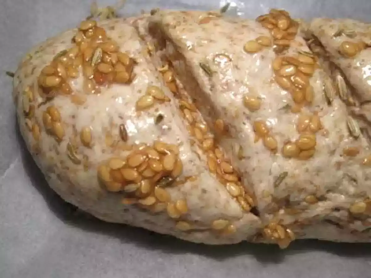 - Lasciarlo lievitare fino al raddoppiamento del suo volume. Ora dividere l'impasto in due, formare due filoncini che vanno incisi in diagonale e cosparsi ancora con dei semi di finocchio e con i semi di lino lasciati da parte.