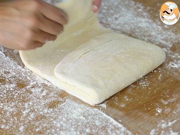 Sigillate i bordi, facendo pressione con il matterello poi stendetela formando un rettangolo più regolare possibile. Prendete la base della sfoglia e piegatela portandola ai 2/3 della sua lunghezza. Poi ripiegate l'altra parte della sfoglia facendola combaciare con l'estremità della prima piega. Tirate gli angoli affinché gli strati siano più uniformi possibile.