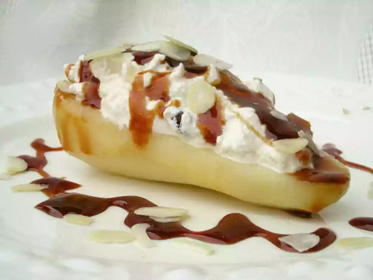 Pere al forno con ricotta e salsa al caramello vota adesso PrecedenteProssimo Altrofacile50 min Invia questa ricetta ad un amico Stampa la ricetta Contatta l'autore della Ricetta Pubblica la foto di questa ricetta Ingredienti 4 una pera 130 g di ricotta 1 cucchiaio di zucchero 1 cucchiaio di uva secca 2 cucchiai di mandorle a scaglie 1 cucchiaio di liquore preferito 1 cucchiaio di yogurt bianco cannella