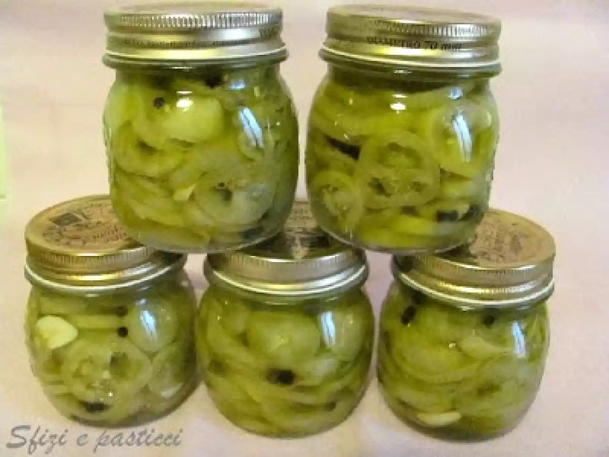 - Tagliare i pomodori ancora verdi a fettine di circa mezzo centimetro, io ho usato i san marzano; via via che si tagliano metterli a strati dentro una ciotola, cospargerli generosamente con sale fino, senza paura che vengano troppo salati tanto dopo vengono "lavati" dall'aceto, e lasciarli riposare per 24 ore.
