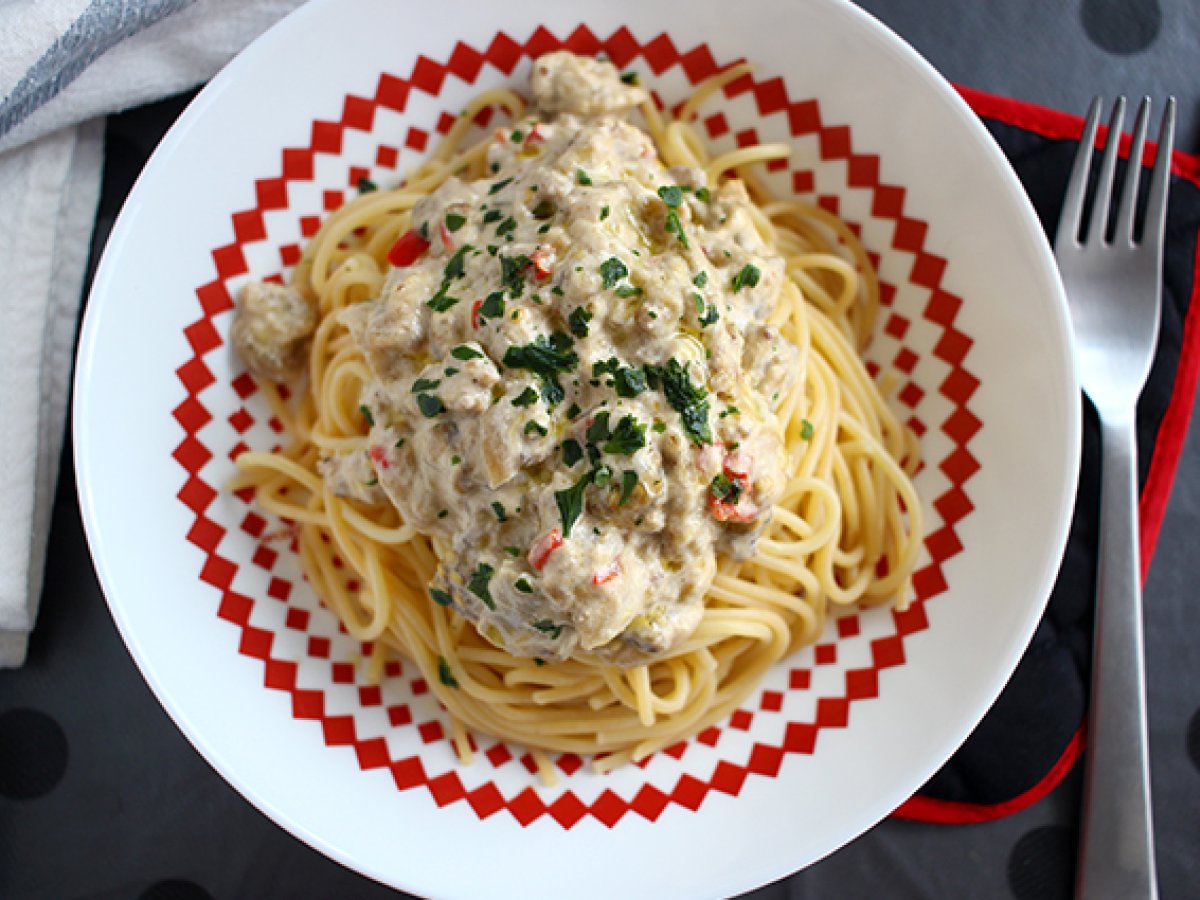 Salsa cremosa per condire la pasta - carne macinata, melanzane e peperoni