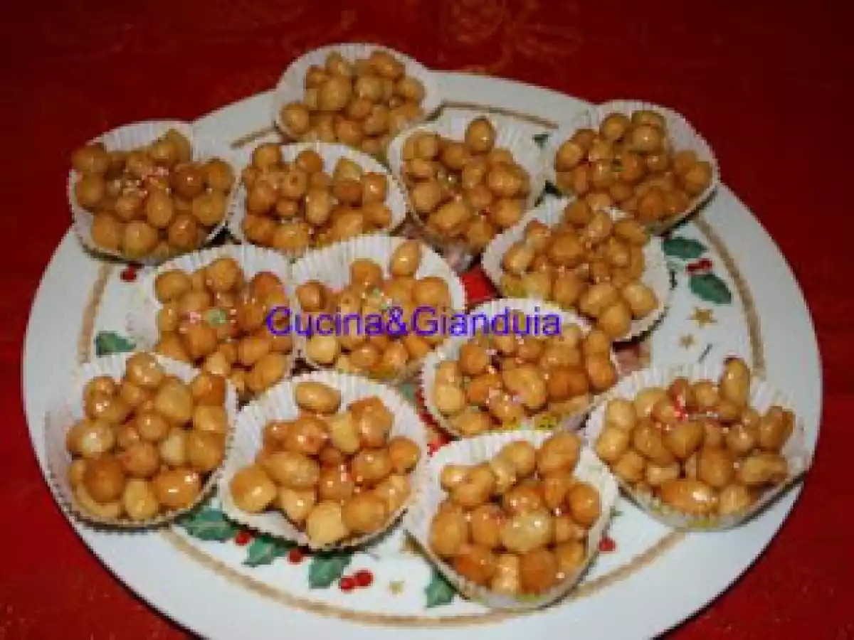 - Disporre gli struffoli su un piatto dando la forma di ciambella o piramide oppure metterli a cucchiaiate, su pirottini di carta in modo da avere sempre pronte delle pratiche monoporzione. Possono essere abbelliti con cedro, frutta candita, diavolini, confetti argentati etc.
