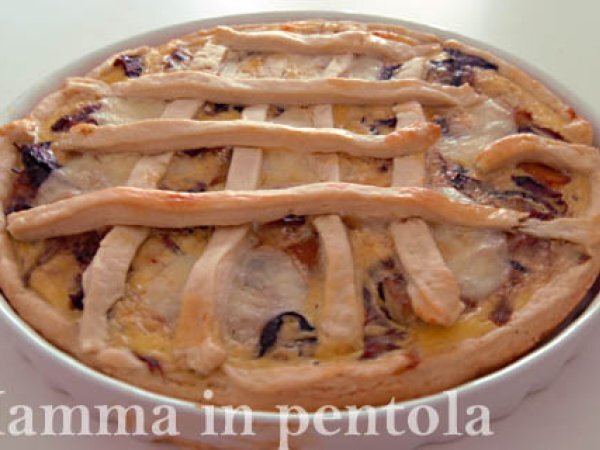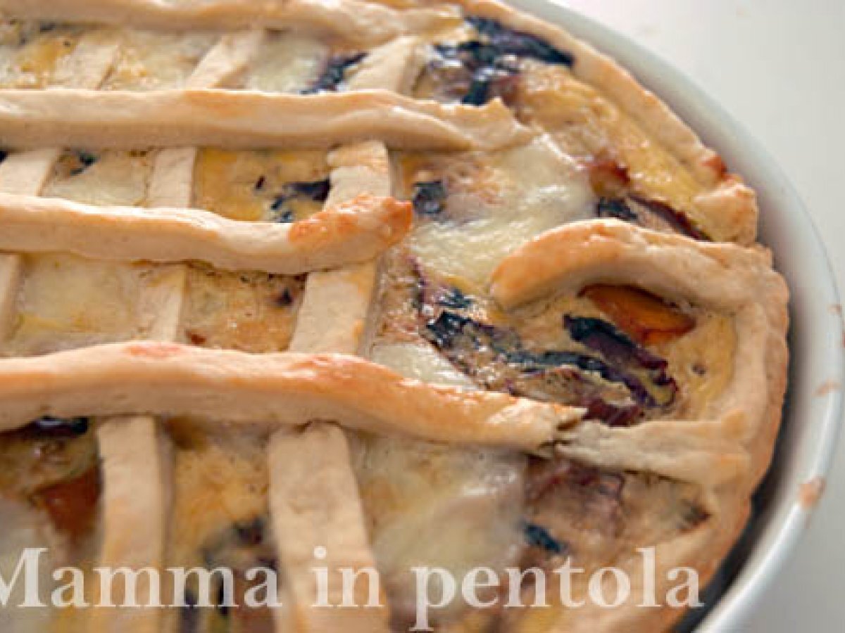 Torta (rustica) radicchio rosso, zucca gialla e gorgonzola vota adesso PrecedenteProssimo Altrofacile55 min Invia questa ricetta ad un amico Stampa la ricetta Contatta l'autore della Ricetta Pubblica la foto di questa ricetta Ingredienti 5 Per la pasta 500 g di farina 1 bicchiere d'olio un pizzico di sale 1 bustina di lievito per torte salate Bartolini acqua Per il ripieno 1/4 di radicchio rosso tondo 100 g di zucca senza buccia 1 finocchio 70 g di gorgonzola parmigiano a volontà 1 uovo latte 2 philadelphia mini sale, pepe, origano
