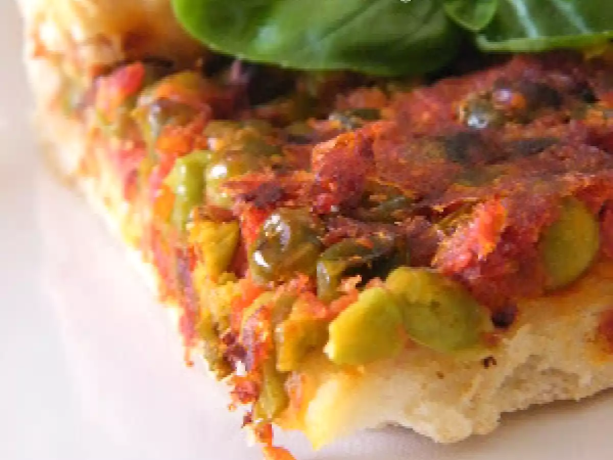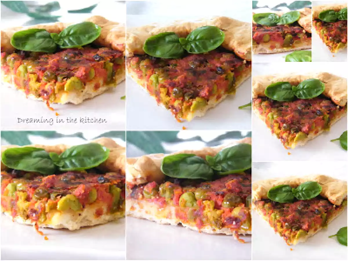 Torta salata con piselli e pomodoro PrecedenteProssimo Altrofacile1 ora Invia questa ricetta ad un amico Stampa la ricetta Contatta l'autore della Ricetta Pubblica la foto di questa ricetta Ingredienti 2 125 g farina "00" 1/2 cucchiaino di sale 1/2 cucchiaino di bicarbonato di sodio 40 g olio leggero di mais o di riso 50 ml acqua calda 2 pomodori maturi 200 g piselli surgelati 1/2 cipolla rossa, grattugiata 1 cucchiaio di basilico fresco, tagliato finemente 1/2 cubetto di dado vegetale o 1 cucchiaino di brodo vegetale granulare 1 cucchiaio d'olio leggero di mais o riso