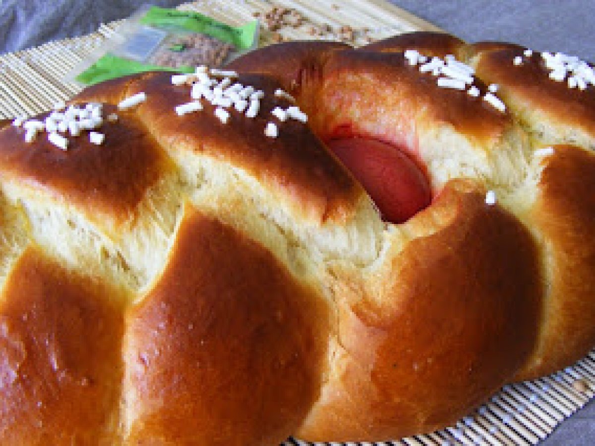 - Decorare con le uova a piacere e mettere a lievitare. Quando sarà un pò più che raddoppiato, spennellare col tuorlo sbattuto col cucchiaio di latte e decorare con la granella.