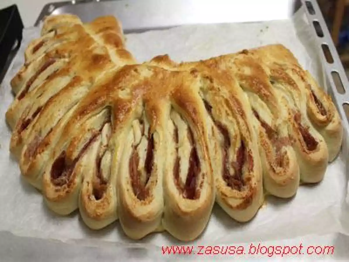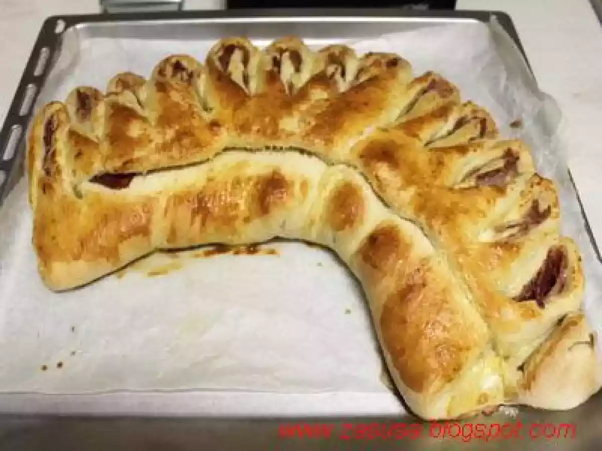 Ventaglio delle sorelle simili PrecedenteProssimo Altrofacile1 ora1281 Kcal Invia questa ricetta ad un amico Stampa la ricetta Contatta l'autore della Ricetta Pubblica la foto di questa ricetta Ingredienti 3 per il lievitino: 150 gr di farina 90 gr di acqua 25 gr di lievito di birra per l'impasto: 350 g di farina 50 g di acqua 100 g di burro ammorbidito 30 g di zucchero 10 g di sale 2 uova per la farcia: 100 g di parmigiano grattugiato 100 g di prosciutto cotto 100 g di salame a fette 1 uovo per spennellare Costo stimato: 7.33Euros€ (2.44€/Porzioni)