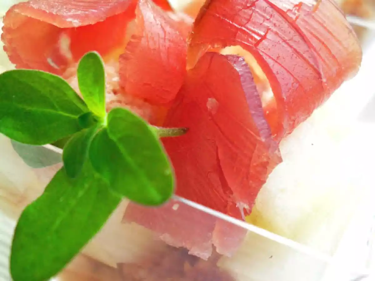 3 - insalata di melone bianco con tonno affumicato PrecedenteProssimo Antipastofacile25 min736 Kcal Invia questa ricetta ad un amico Stampa la ricetta Contatta l'autore della Ricetta Pubblica la foto di questa ricetta Ingredienti 2 250 g circa di tonno affumicato affettato 1/2 melone bianco 1 pompelmo rosa 2 fette di pane integrale 3 cucchiai di olio extravergine di oliva Maggiorana fresca o erba cipollina per guarnire Sale e pepe