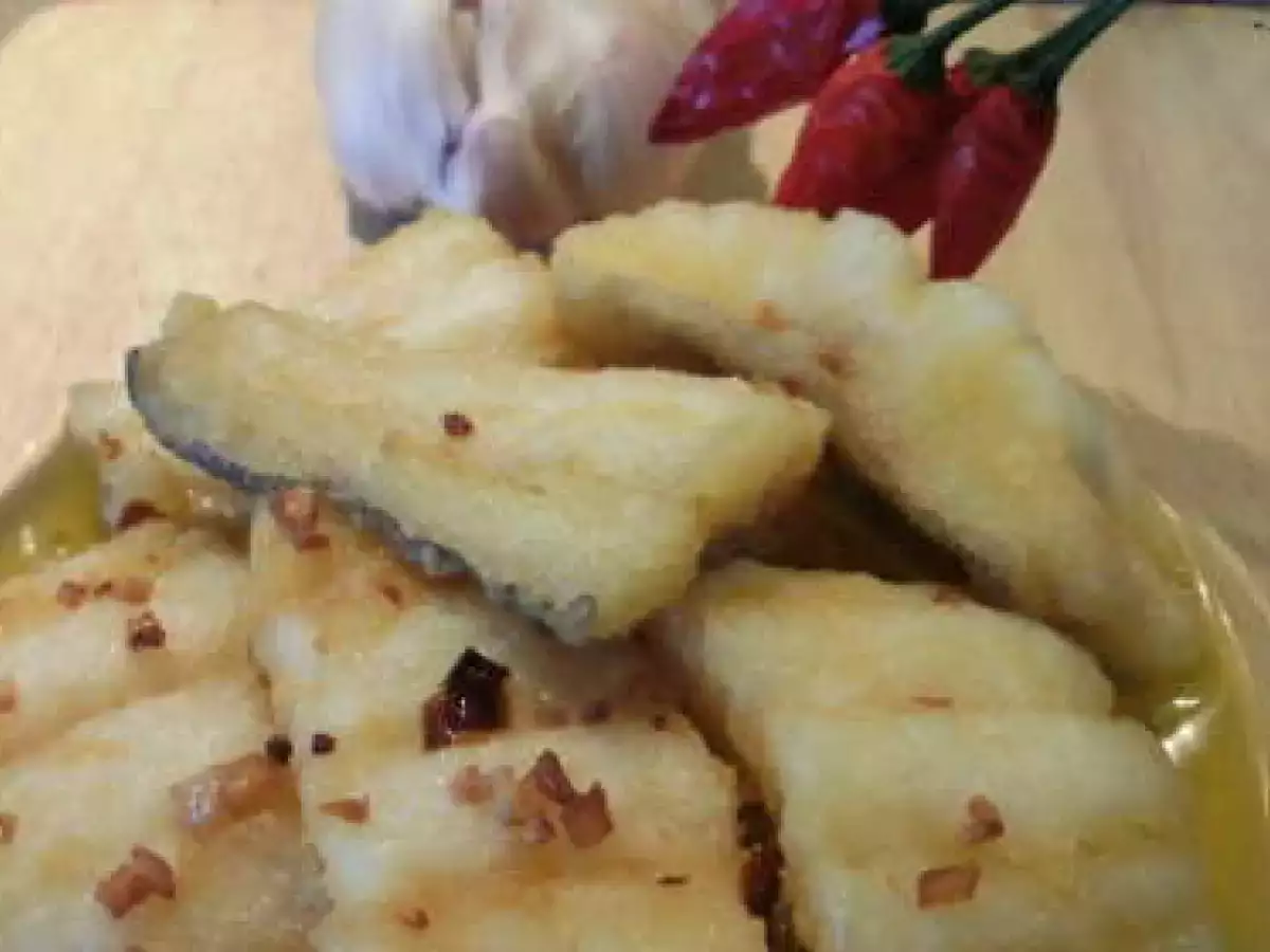 Baccalà sotto il pesto PrecedenteProssimo Antipastofacile35 min3 Kcal Invia questa ricetta ad un amico Stampa la ricetta Contatta l'autore della Ricetta Pubblica la foto di questa ricetta Ingredienti 4 1 filetto di baccalà ammollato, circa 600 gr, olio per friggere, farina, olio extravergine, aceto, aglio, peperoncino. Costo stimato: 0.1Euros€ (0.03€/Porzioni)