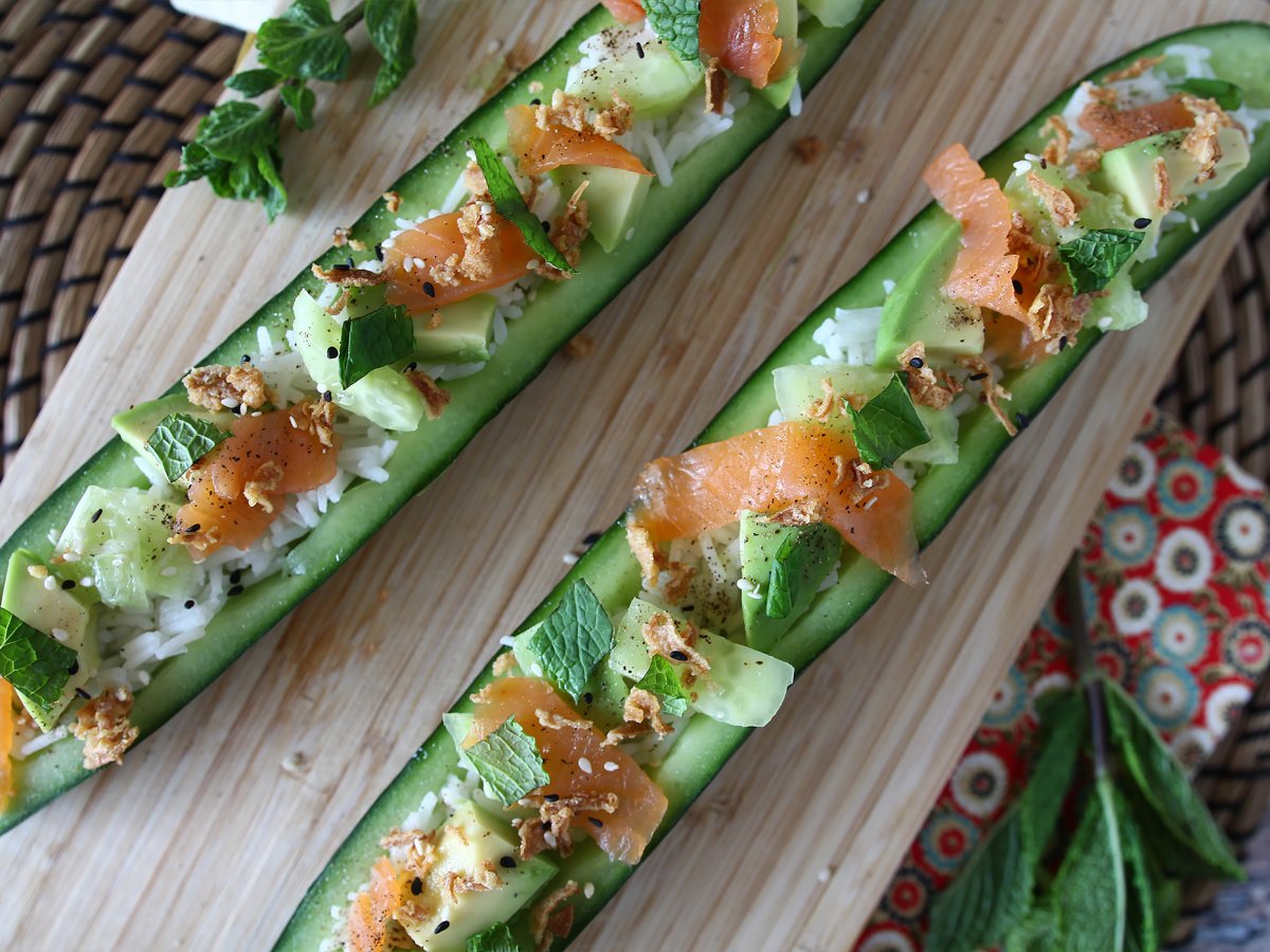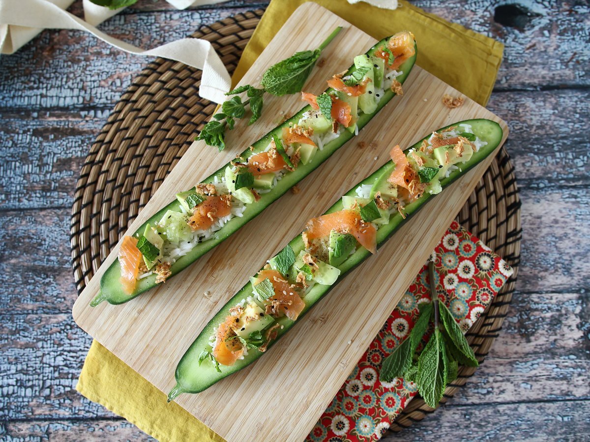 Barchette di cetriolo con riso, salmone affumicato, avocado e menta