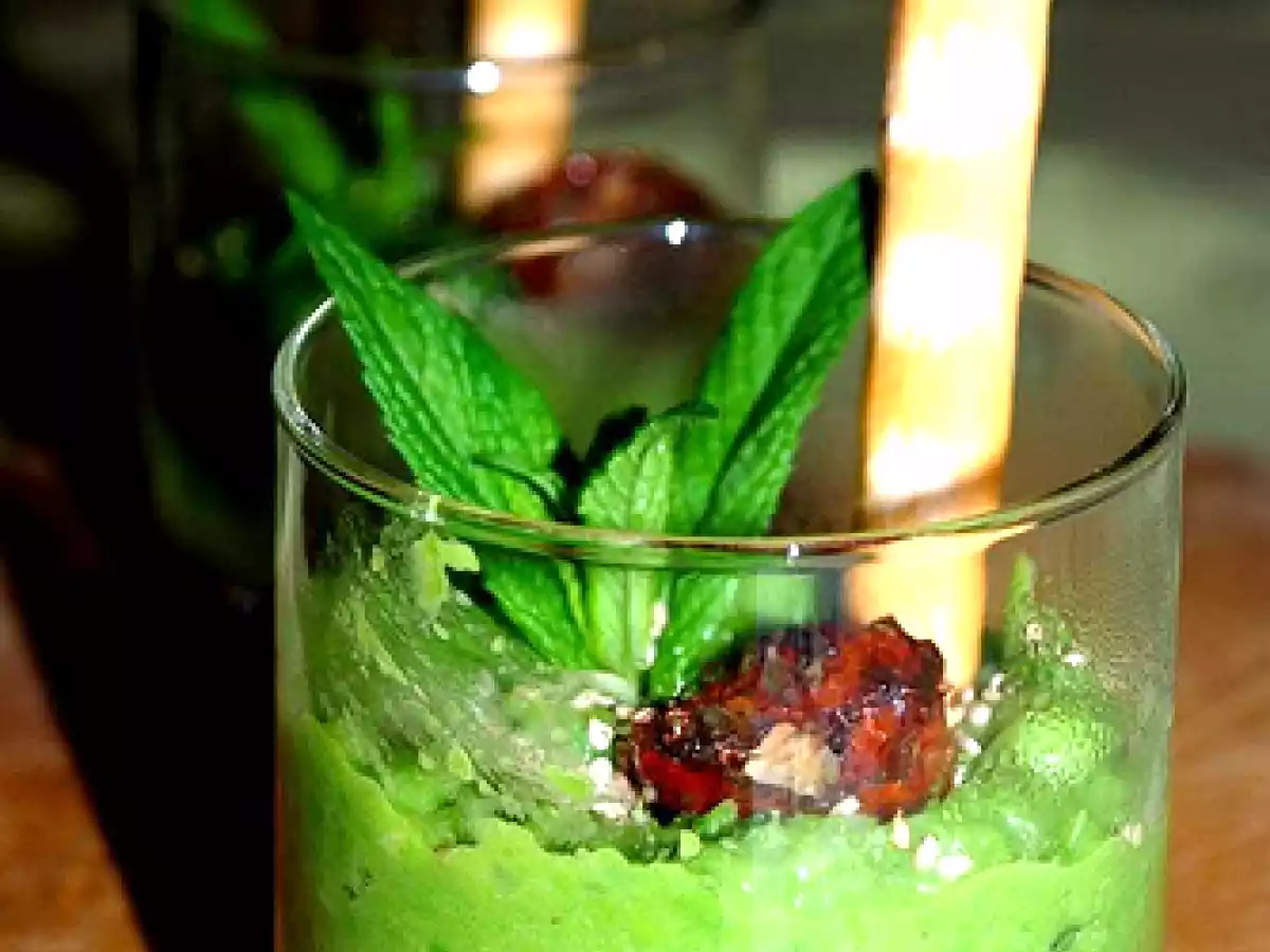 Bicchierini di crema di piselli alla menta, semi di sesamo e pomodorini confit