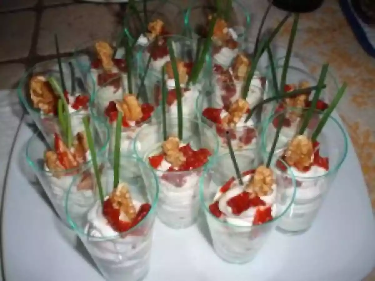 Bicchierino di formaggio di capra con pomodori secchi Antipastofacile40 min375 Kcal Invia questa ricetta ad un amico Stampa la ricetta Contatta l'autore della Ricetta Pubblica la foto di questa ricetta Ingredienti 5 500 g di formaggio di capra cremoso 50 g di pomodori secchi 1 cucchiaio di erba cipollina e timo sminuzzati miele d’acacia latte intero q.b. sale, pepe qualche gheriglio di noce erba cipollina e timo freschi per guarnire Costo stimato: 6.51Euros€ (1.3€/Porzioni)
